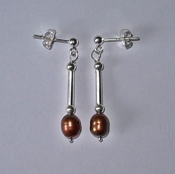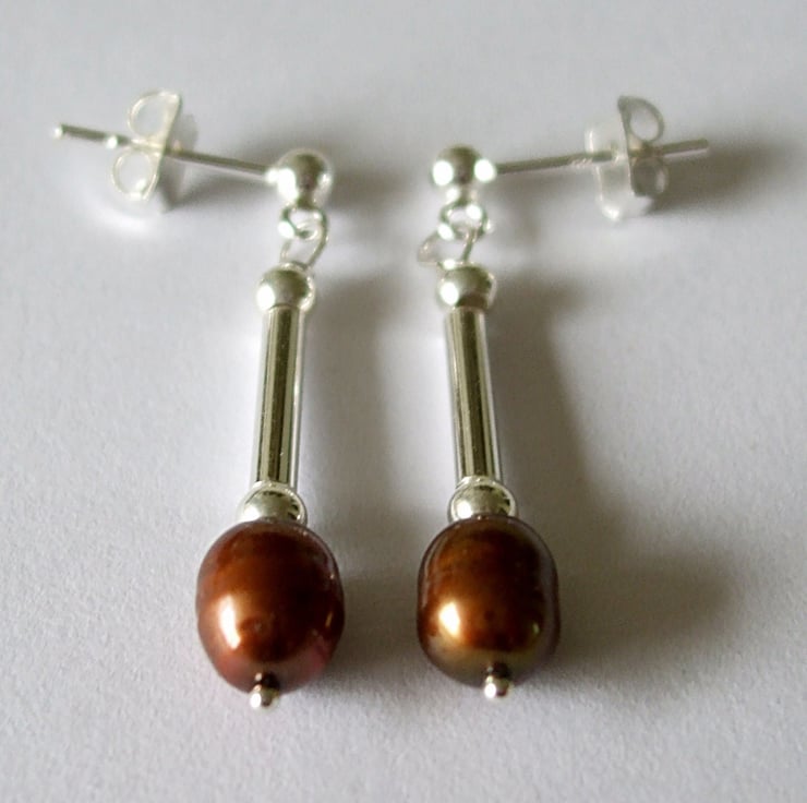 The sterling silver pillar is flanked by two sterling silver beads with a gorgeous bronze freshwater baroque pearl with an almost metallic sheen. The fitting is a sterling silver post and butterfly fastener.