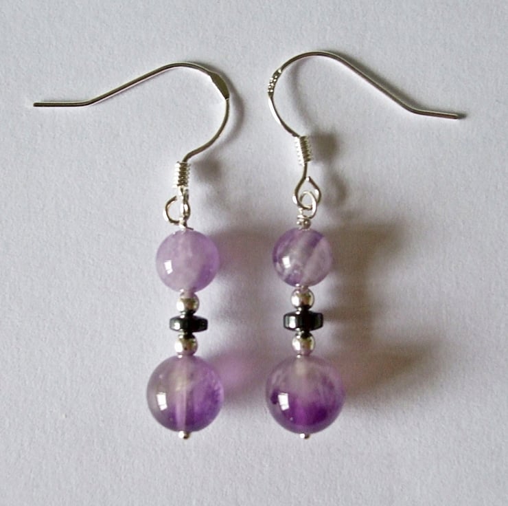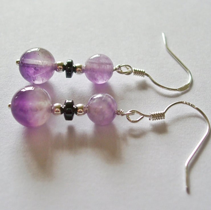 These earrings are made entirely from chevron amethyst rounds, haematite rondelles and sterling silver.