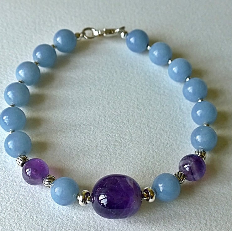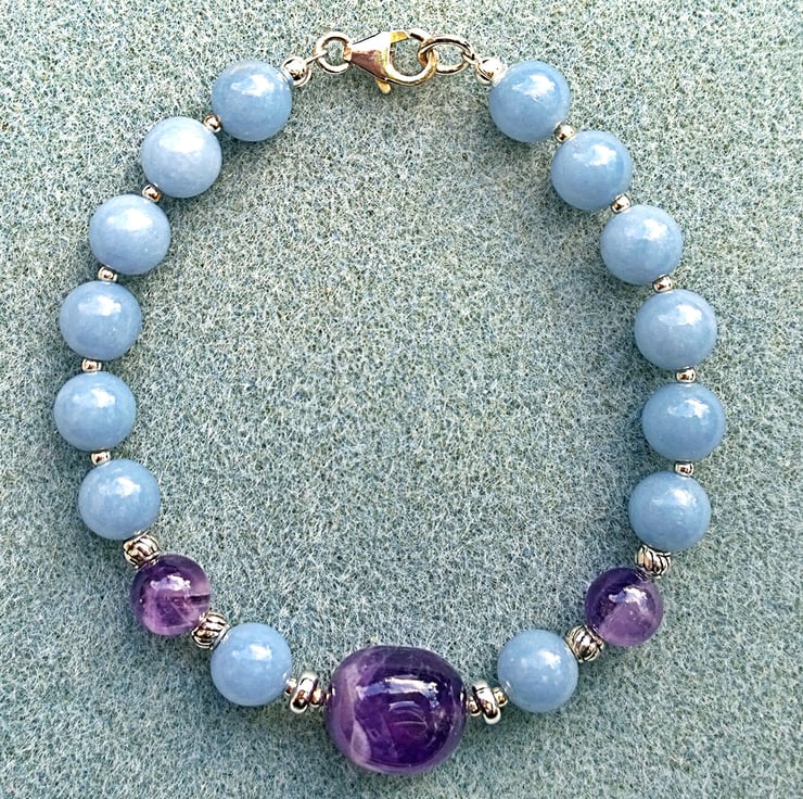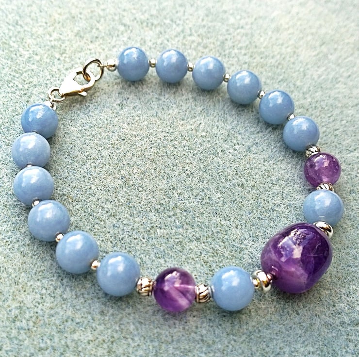 This striking bracelet features a natural shaped smooth polished chevron amethyst nugget ('chevron' because of the arrow shaped markings that often occur within the amethyst) as its focal point with a series of angelite beads and a couple of round chevron amethyst beads to set off the central bead.