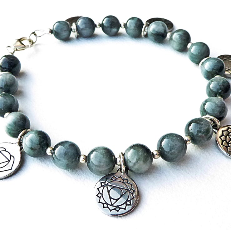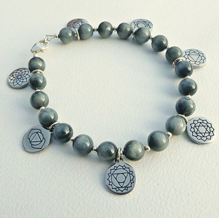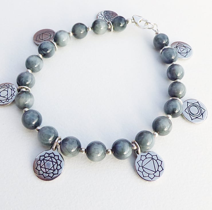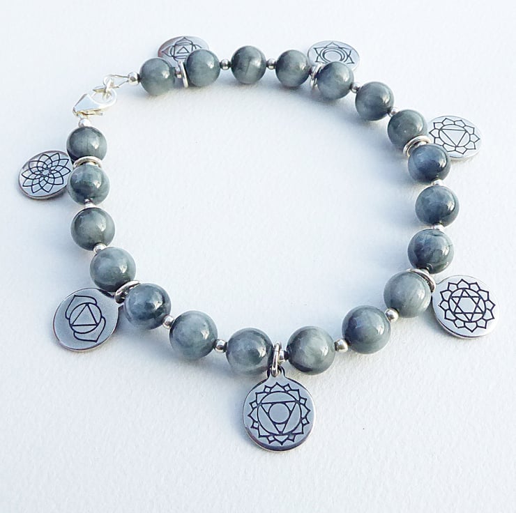 This charm bracelet features the seven major chakras in sequence. The stainless steel engraved charms are evenly spaced between the Hawk's Eye (sometimes called Falcon's Eye) 8 mm with silver plated 2.4 mm beads. The lobster clasp, rings holding the charms and other fittings are sterling silver.