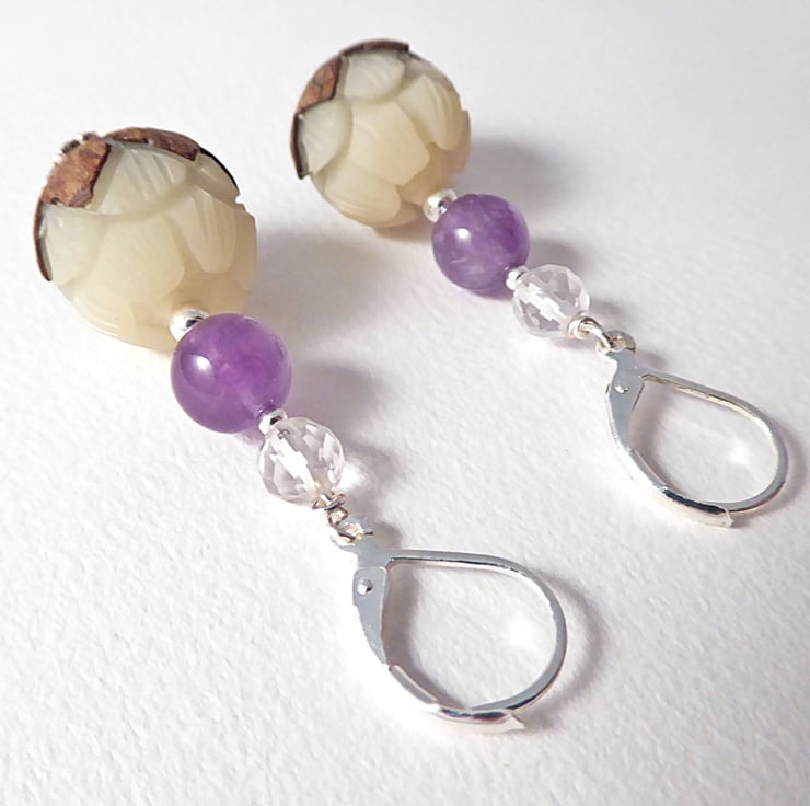 I've made these unusual earrings from hand carved Tagua nuts shaped into finely detailed Lotus flower buds. Above these I've added amethyst beads and faceted rock quartz beads, all separated by sterling silver beads with decorative sterling silver beads caps below the lotus flowers. The comfortable lever back ear fittings are sterling silver.