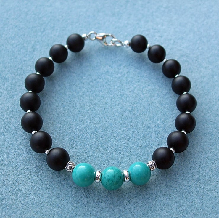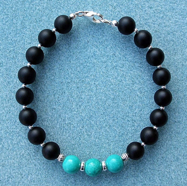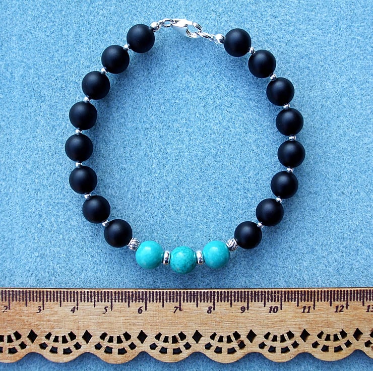 This striking bracelet is made from three turquoise beads separated by sterling silver rings with a patterned sterling silver drum bead at each end leading to gorgeous matt black (frosted) agate 8 mm round beads with 2 mm silver beads in between. The lobster clasp and other metal beads are all sterling silver.