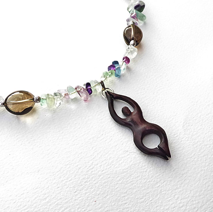 This goddess necklace features a nicely designed hand carved dark wooden goddess figure on a necklace made of natural fluorite nuggets and polished freeform natural smoky quartz pebbles.