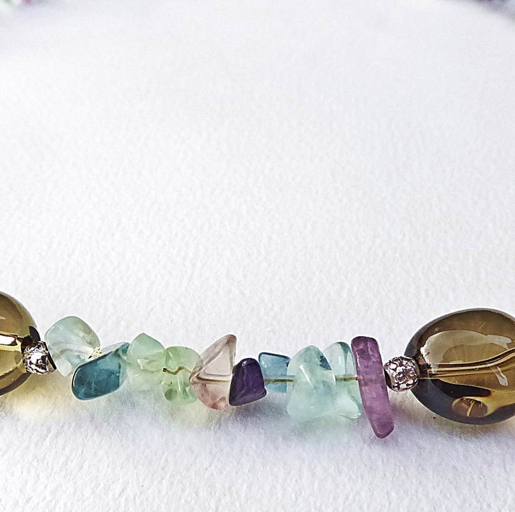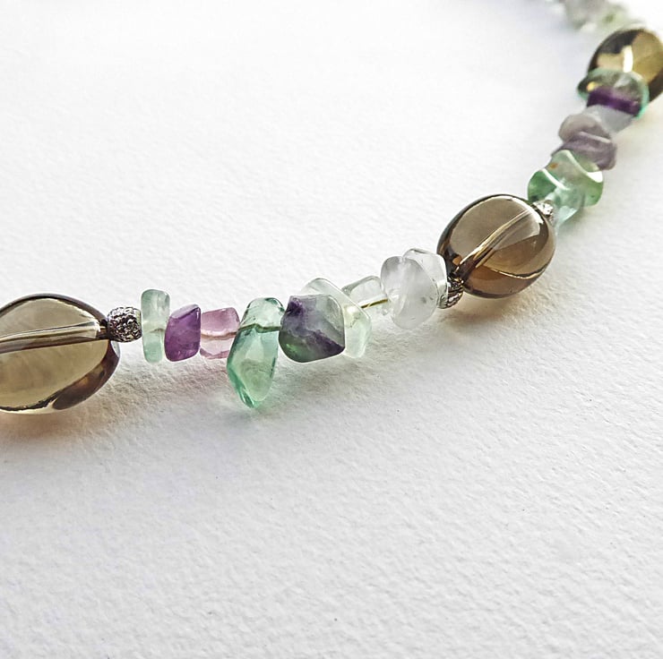 The fluorite has been nicely polished and much of it is translucent, the shades are mostly greens and purples. The smoky quartz pebbles are polished to a glassy finish and have a textured lightly oxidised Hill Tribe silver bead at either side. Hill Tribe silver is at least 97% pure silver and is classed as 'fine silver'. Sterling silver is 92.5% pure for comparison.
