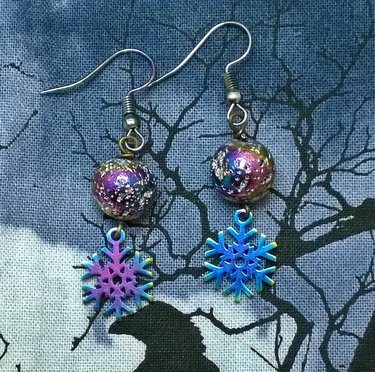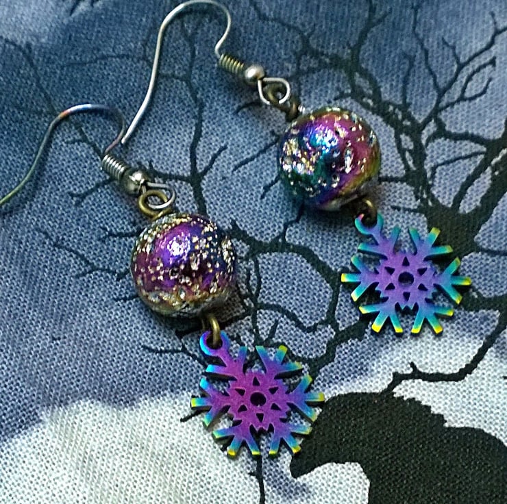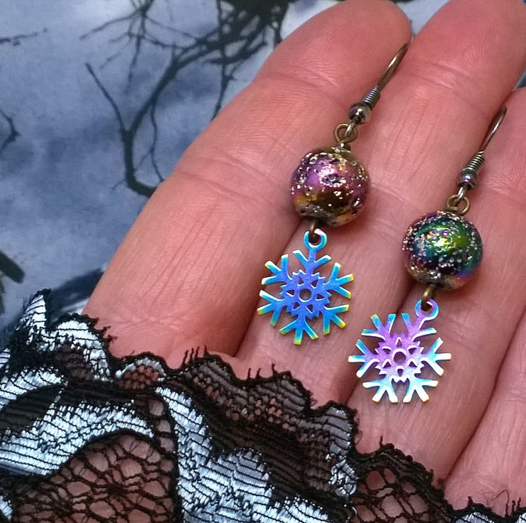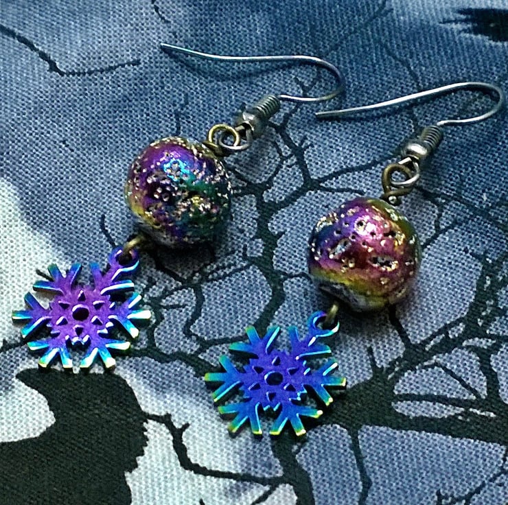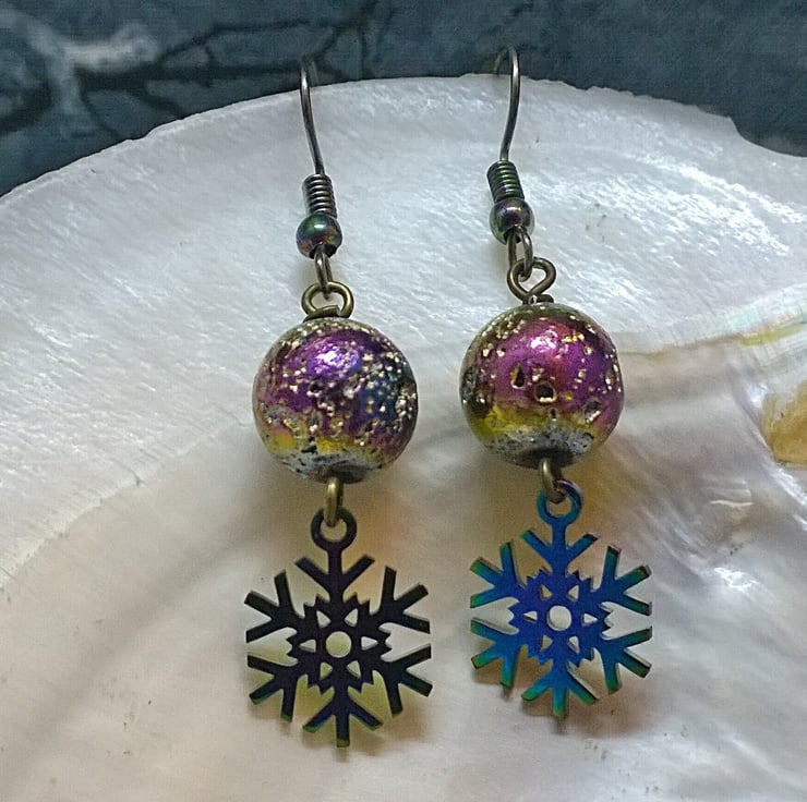 A pair of colourful rainbow snowflake charms and electroplated lava stone earrings that display a range of colours from purples to gold. These are on rainbow plated metal hooks but can easily swapped at no extra cost to bronze tone if preferred.