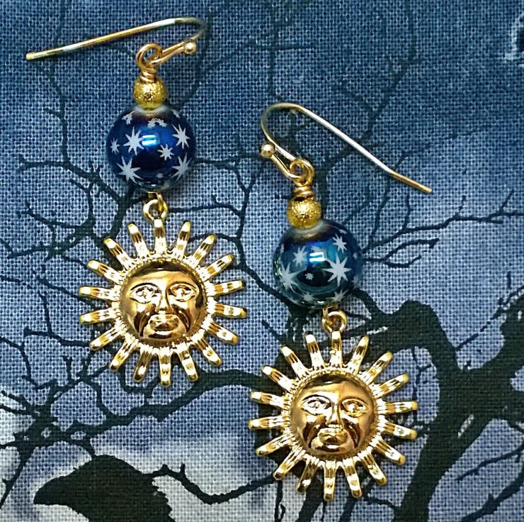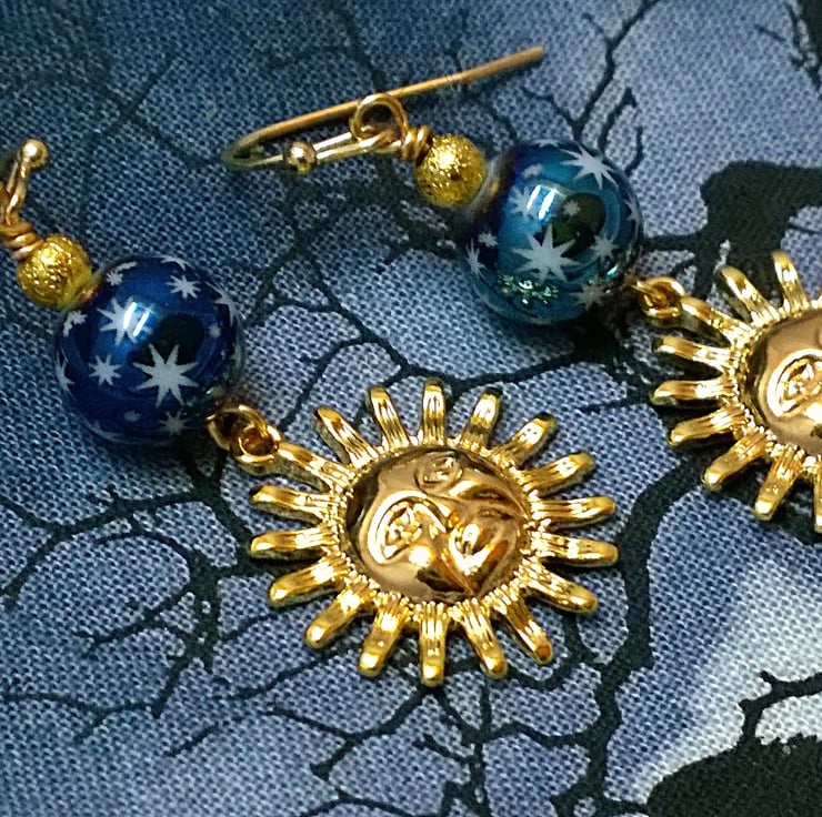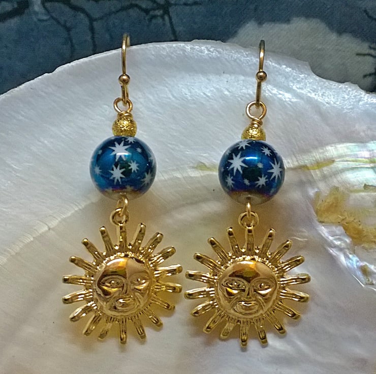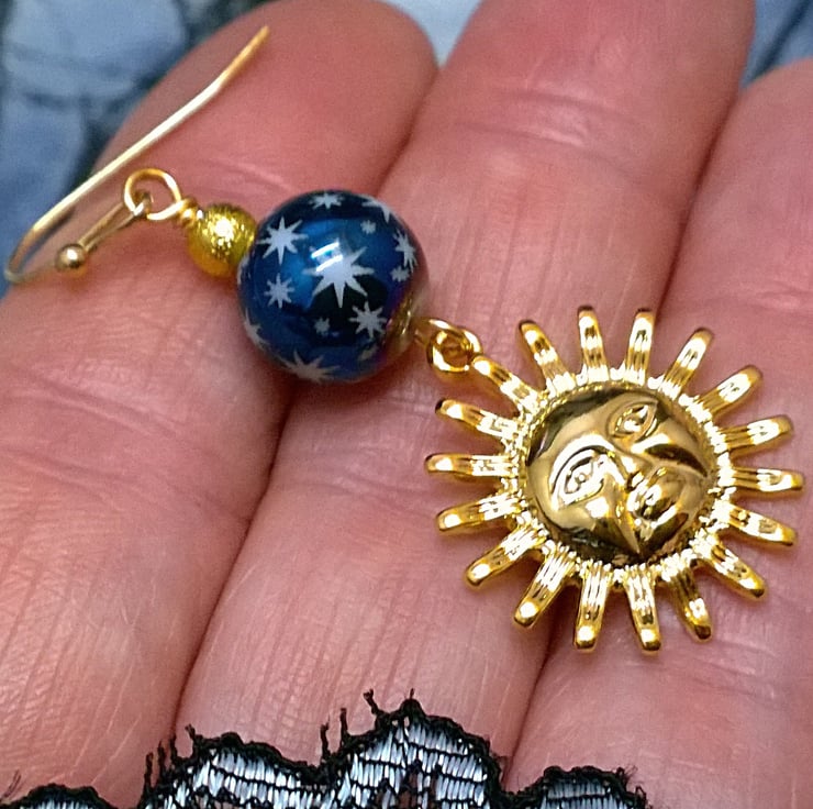 A pair of colourful earrings in blue, featuring a shiny golden sun dangling from a blue starry skies bead. These will arrive in a quality gift pouch.
