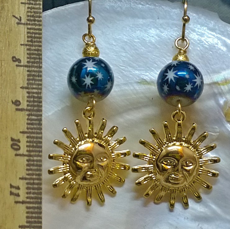 The suns are 18 k gold plated over copper, the 10mm beads are electroplated ceramic, there is also a gold plated bead above the starry bead and the ear wires are a golden metal alloy. All metals used are lead and nickel safe. Please look at all the photos to see the size of these against a scale and my hand.