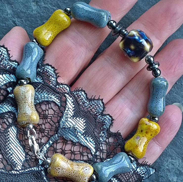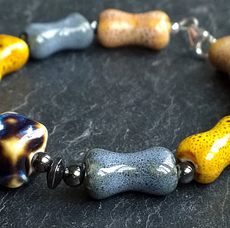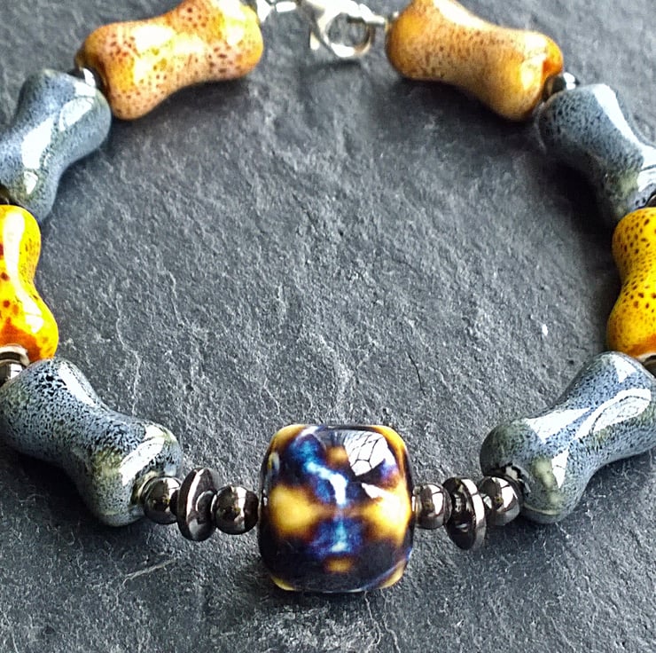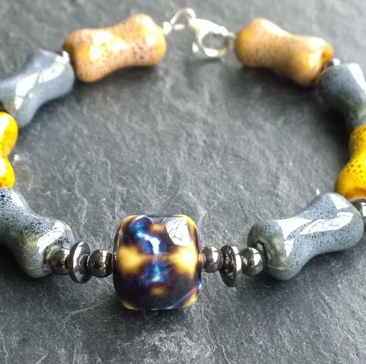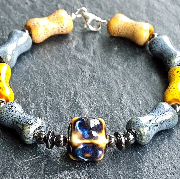 This unusual bracelet is made from ceramic beads in the shape of bones with an abstract ceramic cube at its centre. Either side of the cube is a series of haematite beads and each bone is also separated by haematite. The lobster clasp and round silver beads are sterling silver.