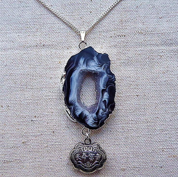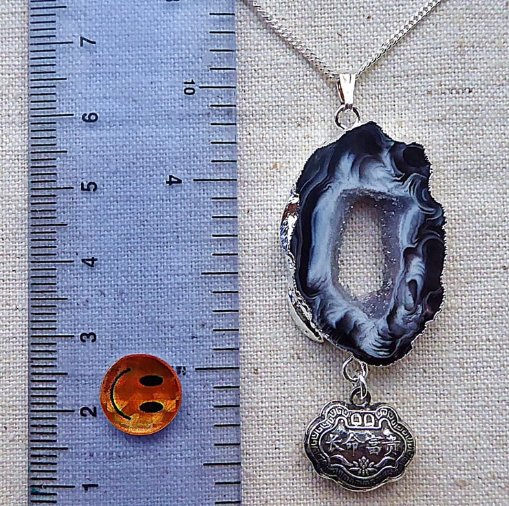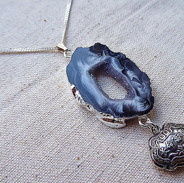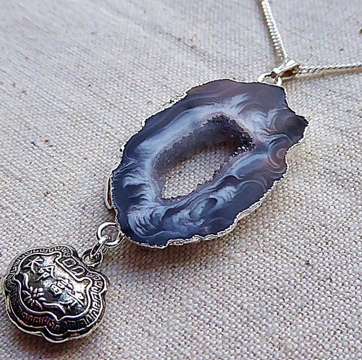 From a slice of Brazilian Agate with glittering drusy (or druzy) crystals in the centre dangles a silver Chinese lock charm. These were traditionally given to people to wear to 'lock' them into a long and healthy life. It is double sided.