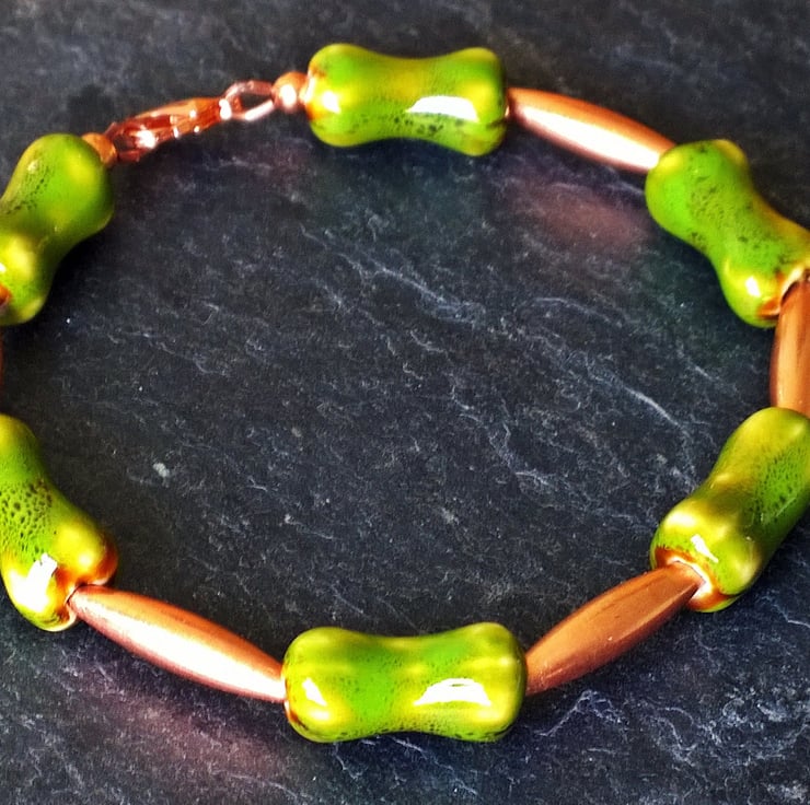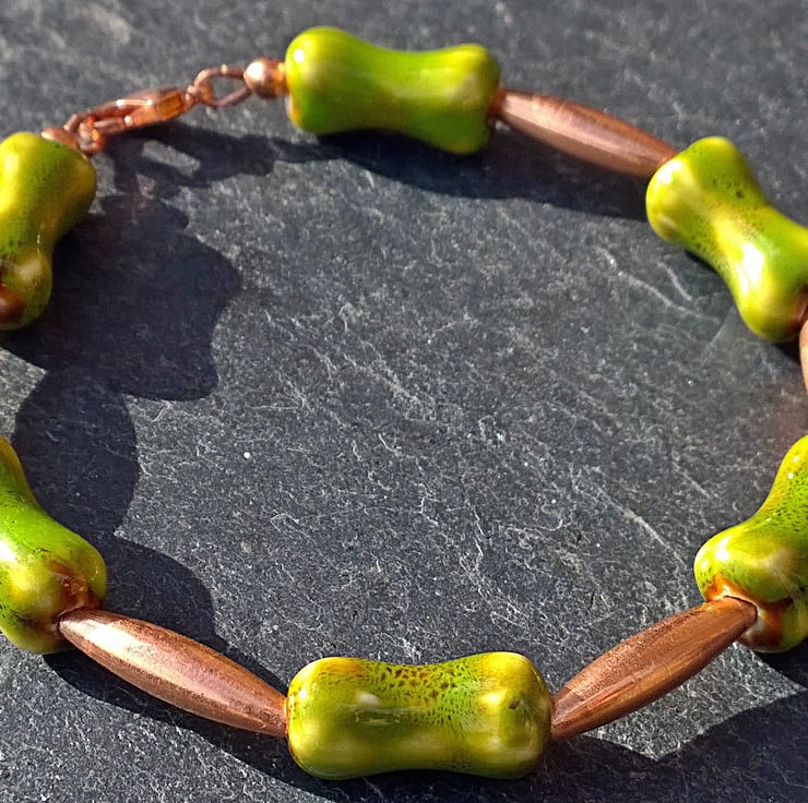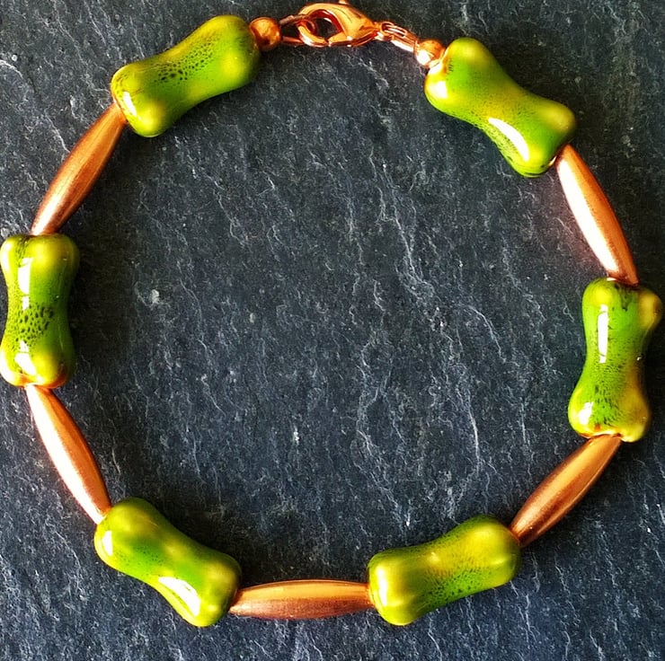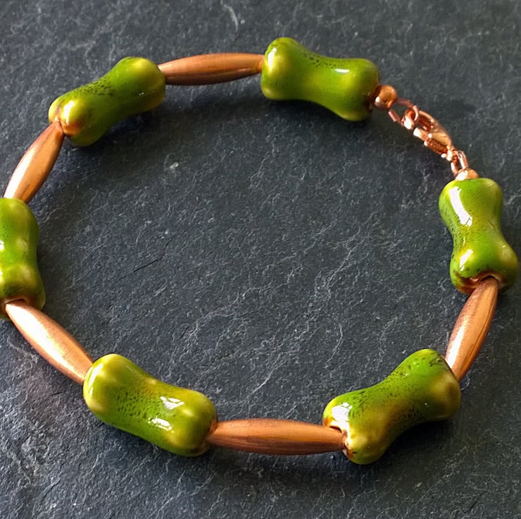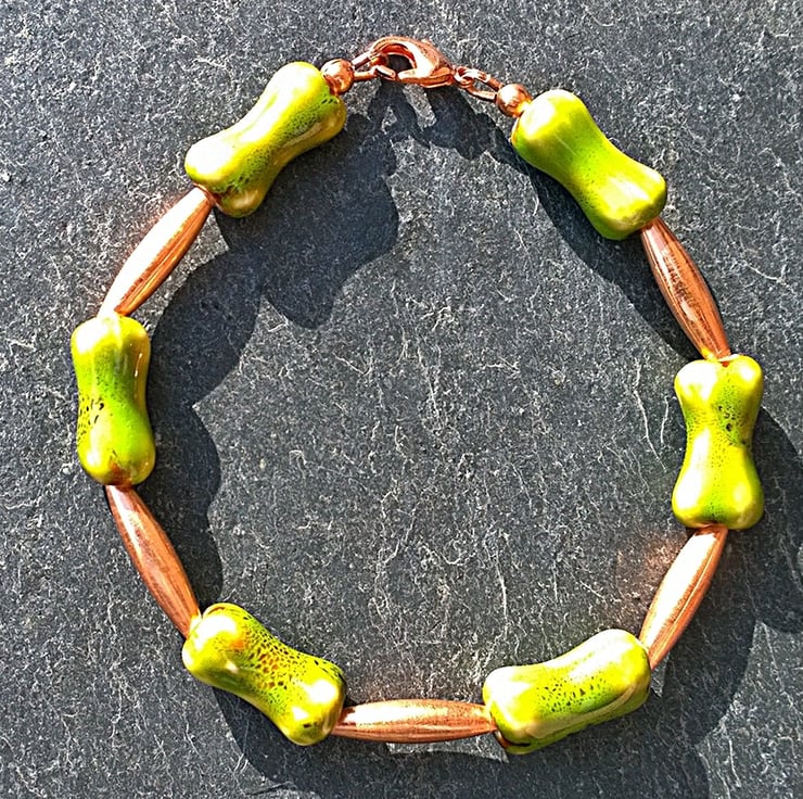 This unusual bracelet is made from ceramic beads in the shape of bones alternating with pure copper beads.