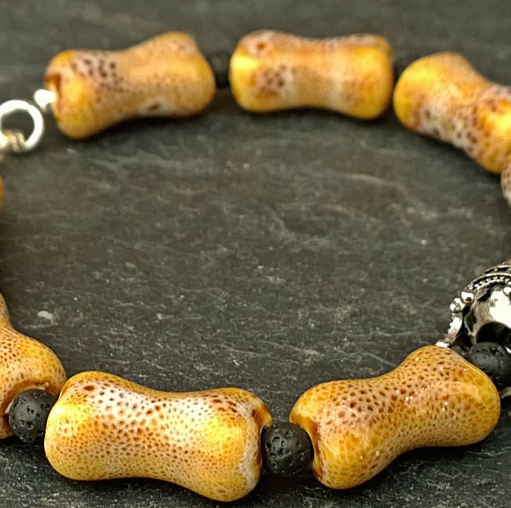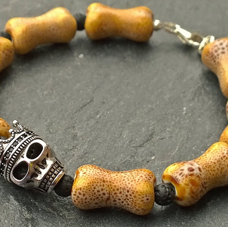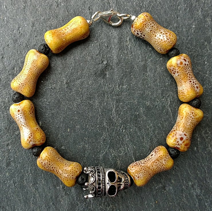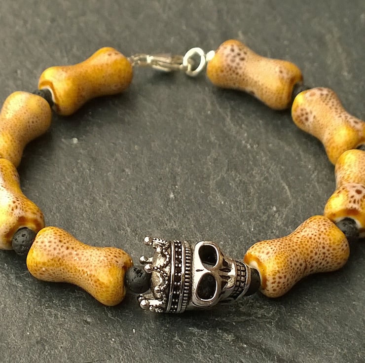 This unusual bracelet is made from bone shaped ceramic beads. Each is separated by a 4mm black lava stone bead. The focal point of this bracelet is a beautifully detailed crowned steel skull inset with black darkly glittering crystals.