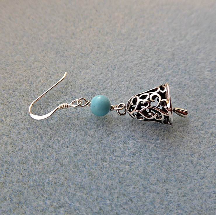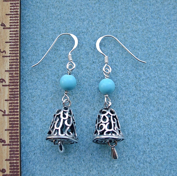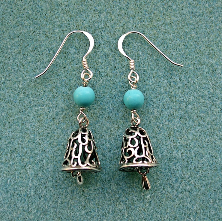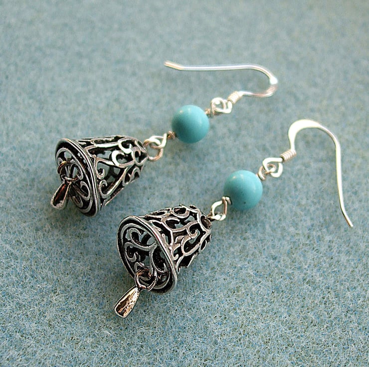 Pretty filigree bell earrings with turquoise coloured magnesite beads.