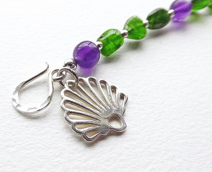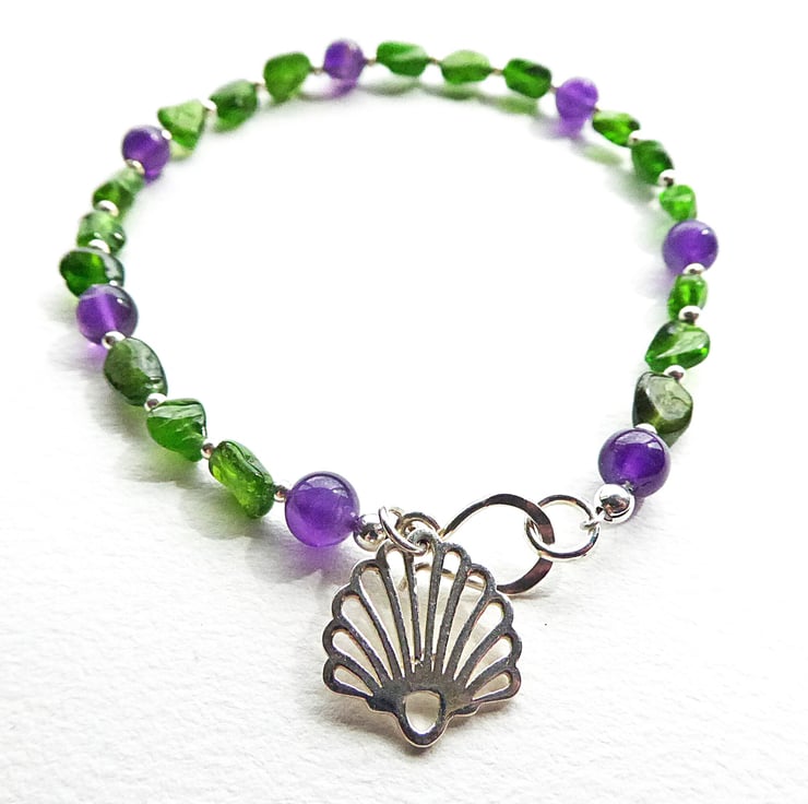 This bracelet is made of rich green chrome diopside naturally shaped polished nuggets and deep purple handcut and shaped round amethyst beads. In between the larger beads are 2 mm sterling silver beads and the fastening is a sterling silver handmade hammered sterling silver hook clasp with a sterling silver shell charm dangling from it. Chrome diopside really is naturally that remarkable green, these stones are not artificially dyed.