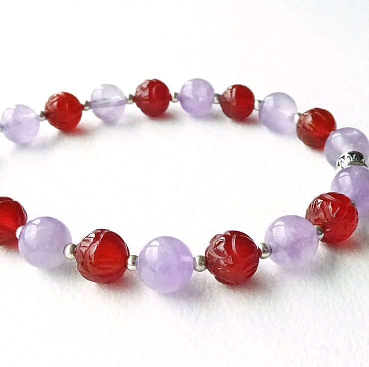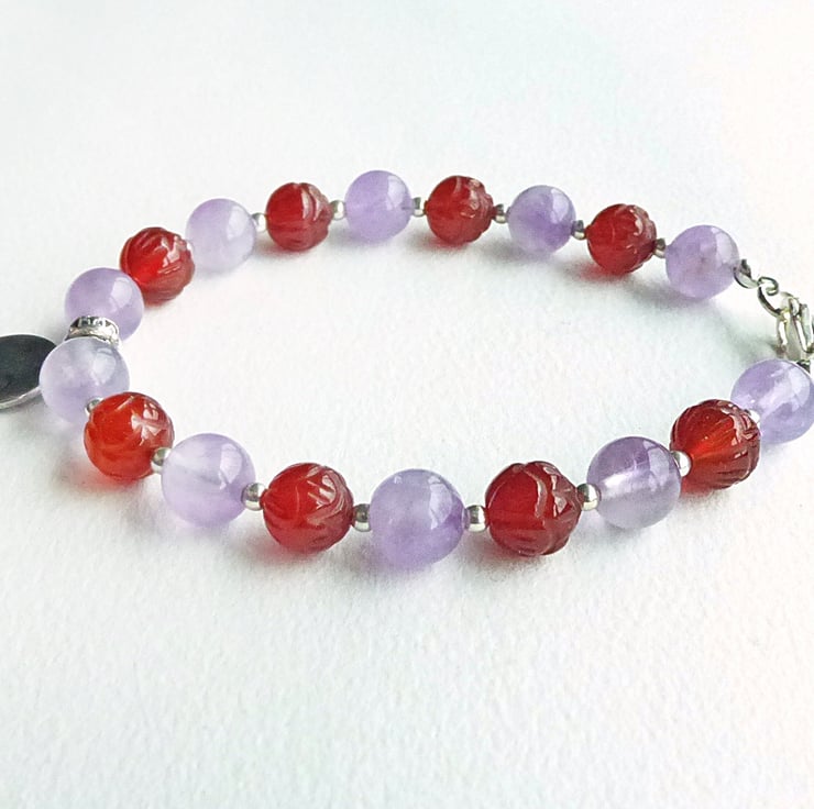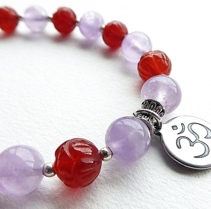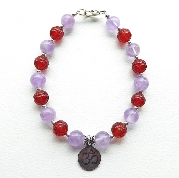 This bracelet is made of beautiful pale amethyst, almost lilac in colour alternating with red carnelian carved lotus flower buds. A hypoallergenic stainless steel Om charm dangles from a sterling silver hourglass shaped fancy bead. In between the larger beads are 2 mm sterling silver beads and the fastening is a sterling silver lobster clasp.