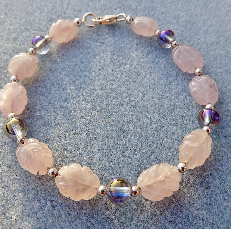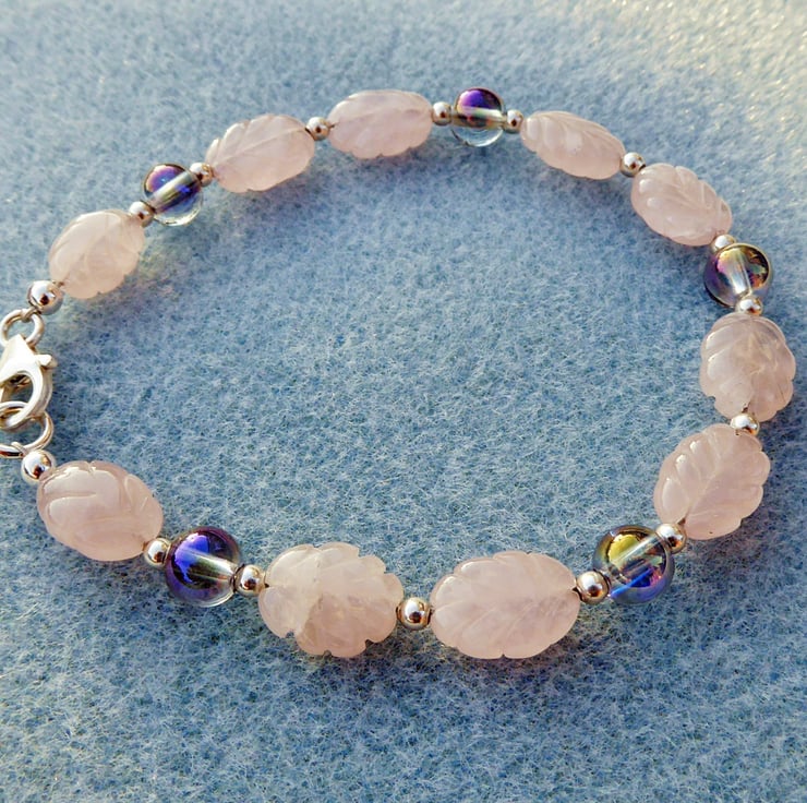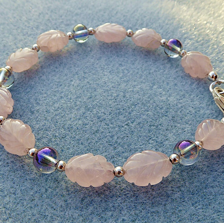 This truly unique bracelet features hand carved rose quartz leaves and 6 mm titanium quartz beads, all separated by silver plated 2.4 mm beads. The titanium coating of the rock quartz beads creates a shimmering array of blues and purples that shift with the light and the angle you hold the bracelet. They remind me of soap bubbles with their iridescent changing colours!