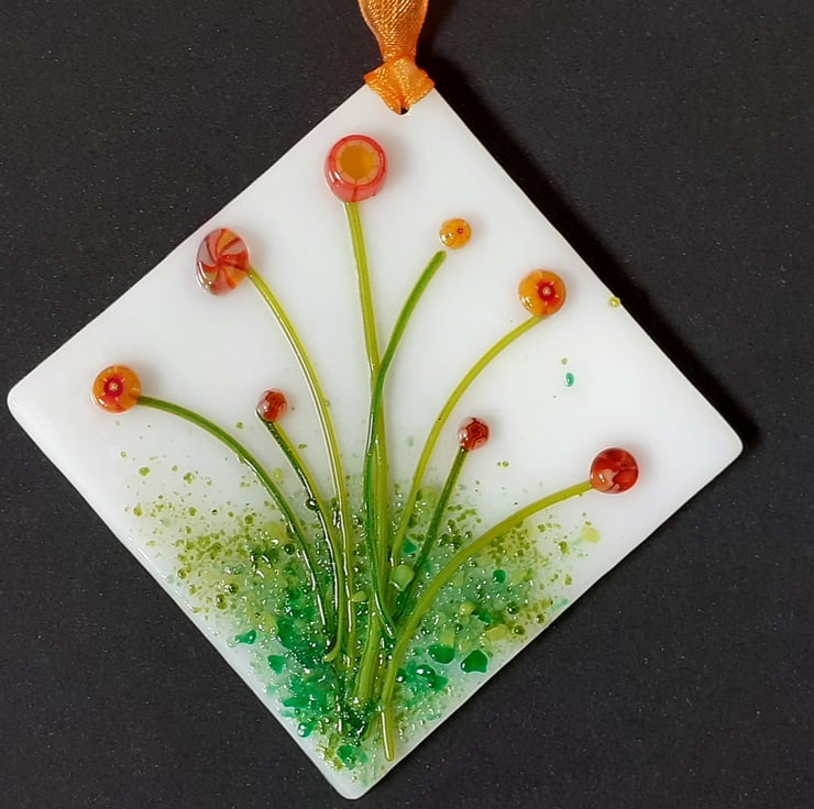 Fused glass miniature hanging decoration in a diamond shape, depicting a selection of flowers in orange and yellow shades, which would make a lovely little keepsake gift.