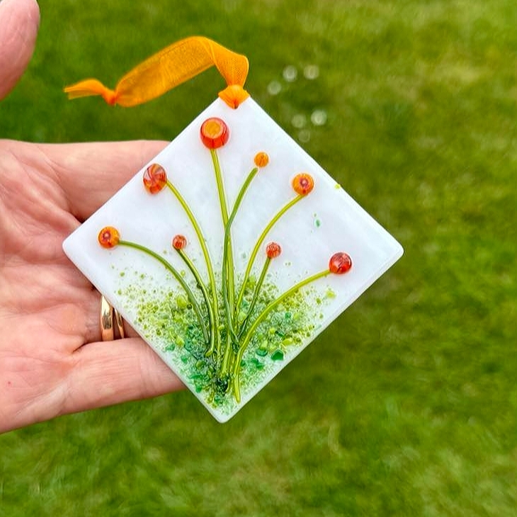 Created from glass powders, murrini and stringers, on a base of white glass, the piece has been kiln-fired, then drilled and strung with a bright orange organza ribbon, ready for hanging. The panel measures 6.5cm square and will be sent in a letterbox size box.