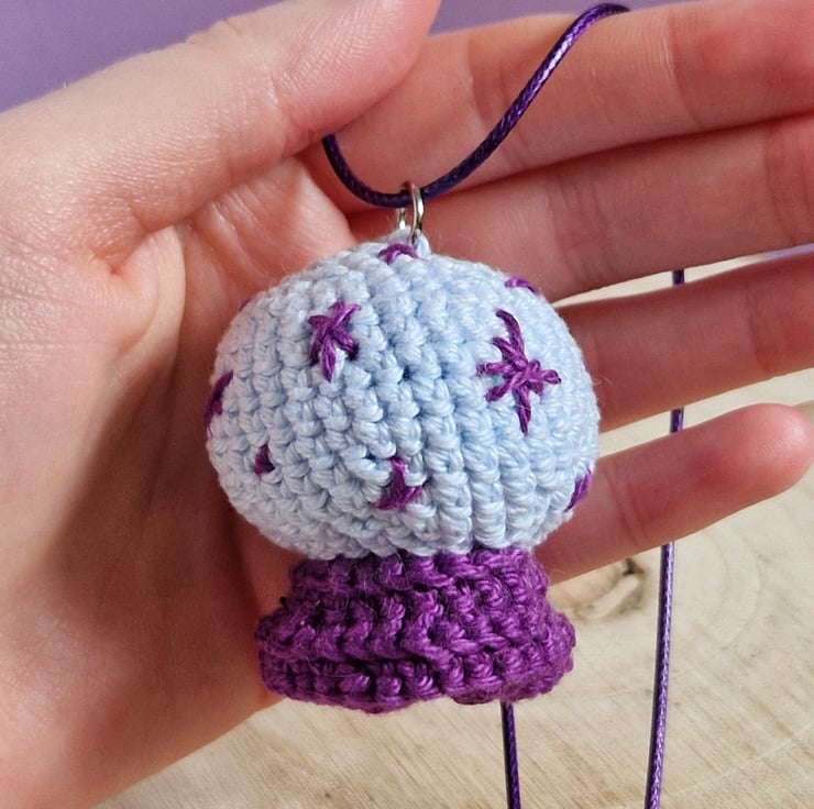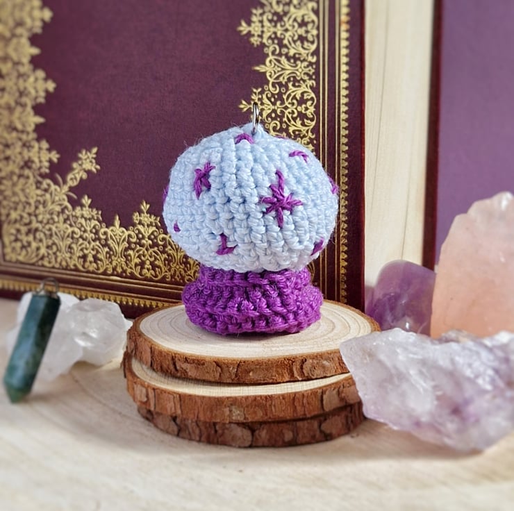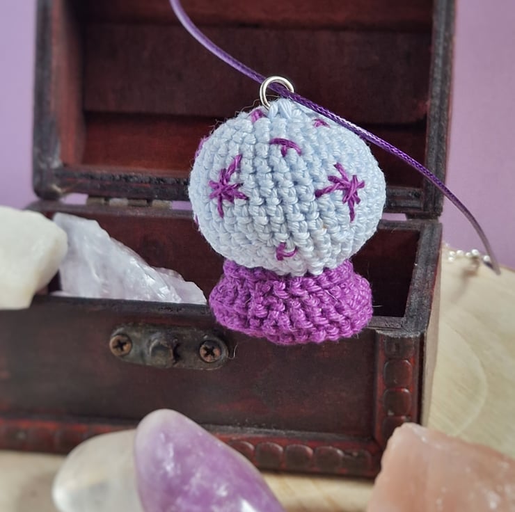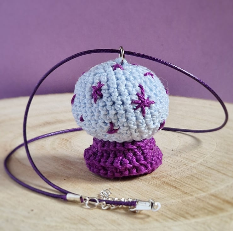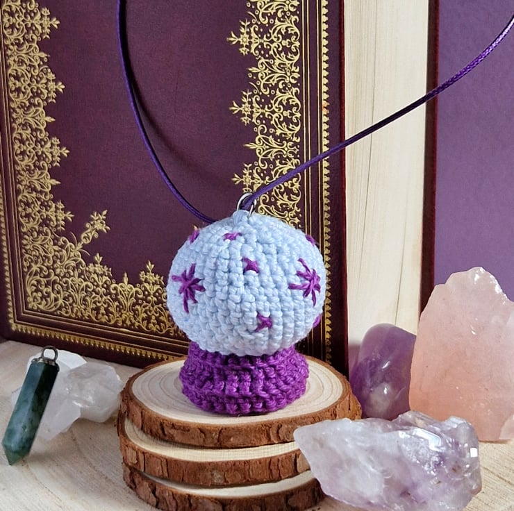 This crystal ball pendant necklace makes a unique, alternative jewellery piece, or a perfect accessory for Halloween! The crystal ball is crochetted from cotton yarn and filled with recycled polyester. The necklace is made from purple polyester cord.