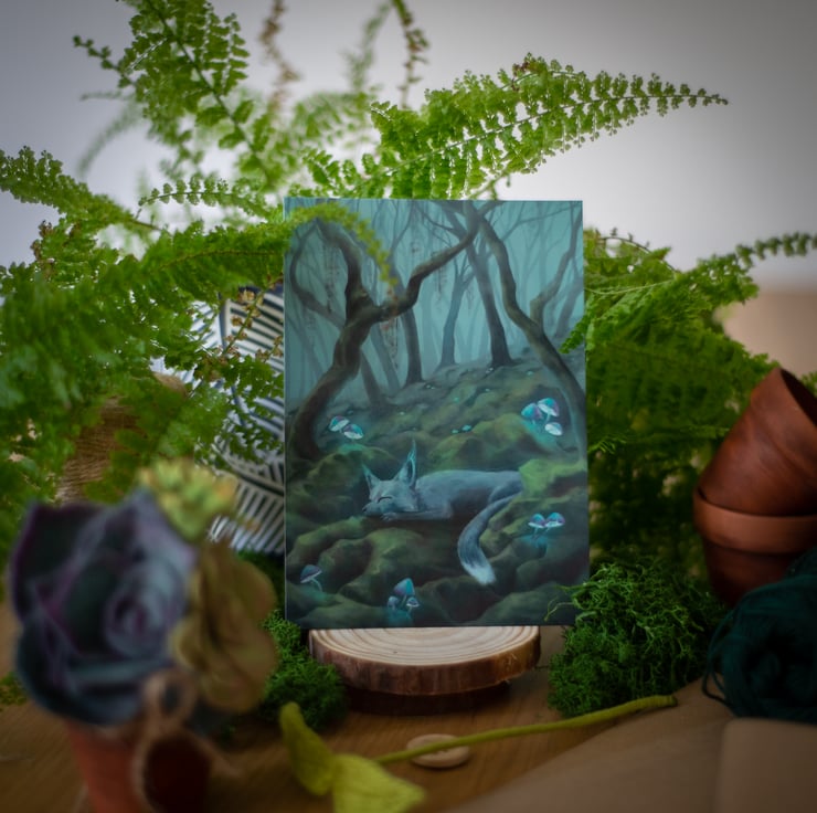 In the heart of the mist-shrouded forest, a spirit fox slumbers—a guardian of secrets and ancient wisdom. Its silver fur blends seamlessly with the tangled foliage. This ethereal small print invites you to wander through veiled realms, where whispers of forgotten tales linger among dew-kissed ferns and mushrooms.