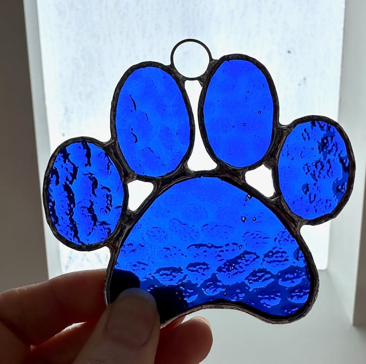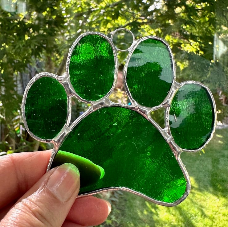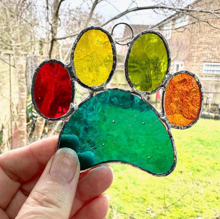 Dog paw print suncatcher handmade in beautiful stained glass by Carole's Glass.