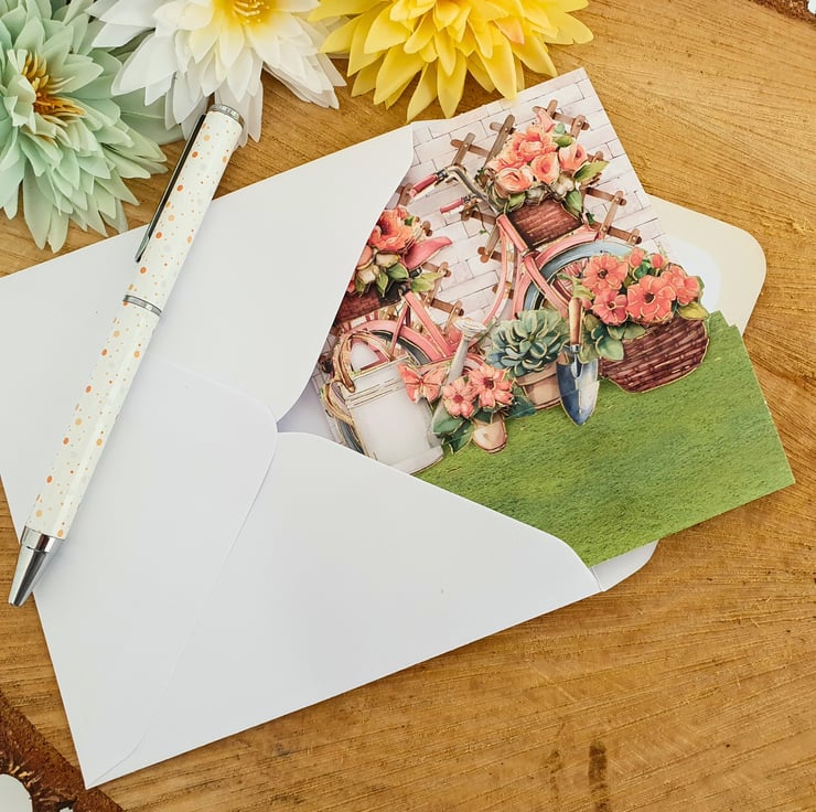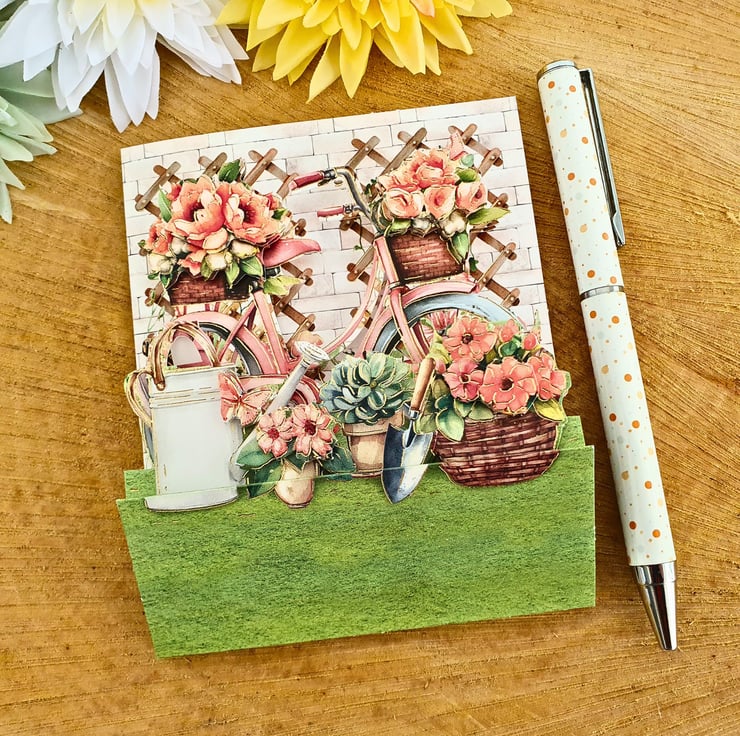 A small pop-up stepper note card, displaying a scene of a bicycle in the garden. 3D decoupaged with up to 3 layers of elements. Perfect for sending your handwritten notes, messages & thank you to a relative, friend, neighbour, colleague and so on!