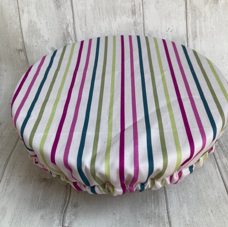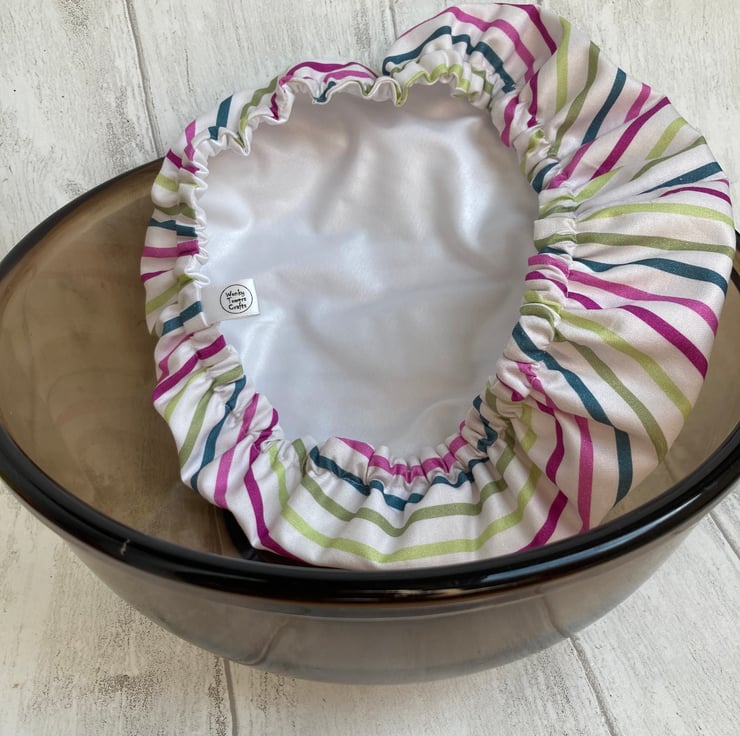 This simple bowl cover will be an asset in your kitchen, helping to keep food fresh and reduce usage of cling film and plastic bags. It is made in an extra large size to fit over a mixing bowl (approx. 30cm diameter) and is ideal for covering proving dough or fruit soaking for the Christmas cake. The cover is made from attractive cotton lined with PUL – a waterproof and breathable fabric, safe for food use (more details below). Elastic threaded into the hem holds the cover securely on your chosen bowl and means that it would also fit different shapes and sizes - use it to cover a dinner plate or lasagne dish. It can be used in the fridge or freezer but is not suitable for microwave use. If soiled, the lining can be wiped clean or the whole cover can be washed in the washing machine and air dried. Our bowl covers are easy to use and hygienic. We find them much more usable than bees wax wraps.
