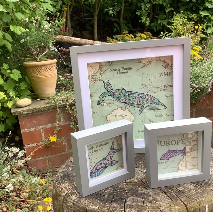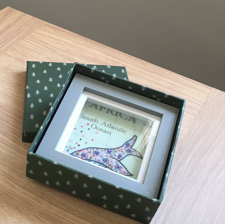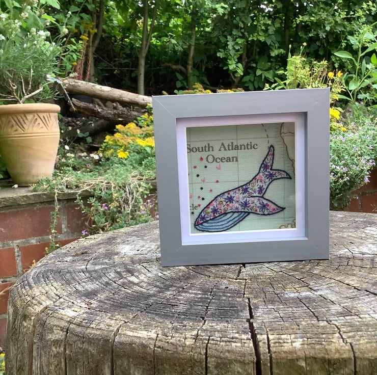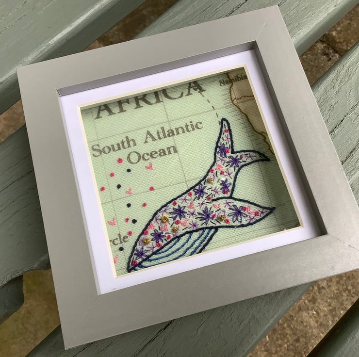 Hand embroidered image of Humpback Whale on cotton fabric showing map grid of South Atlantic Ocean. Whale decorated with hearts and flowers. Embroidery stretched onto board before framing. Measures 12cm square in box frame. This picture will come to you in a gift box.