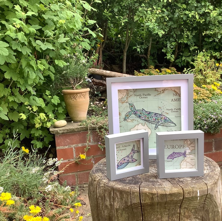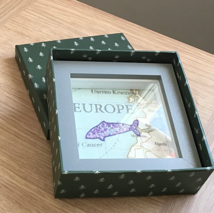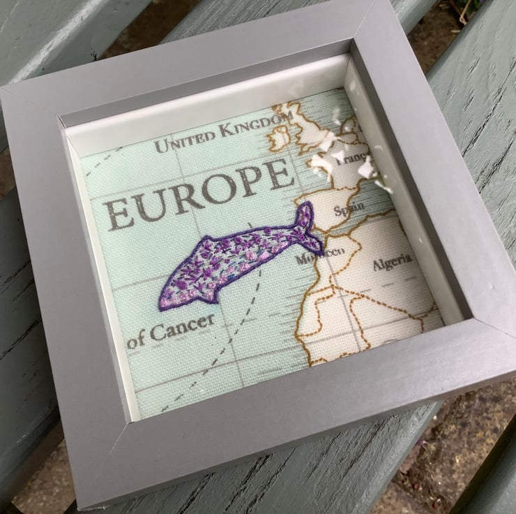 Hand Embroidered Framed Image of a Minke Whale, Embroidered onto Cotton Fabric showing a map of European Waters. Whales body embroidered with flowers. Framed in box frame measuring 12cm square. Hand Stretched onto board before Framing. This picture will come to you in a gift box.