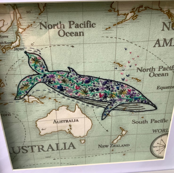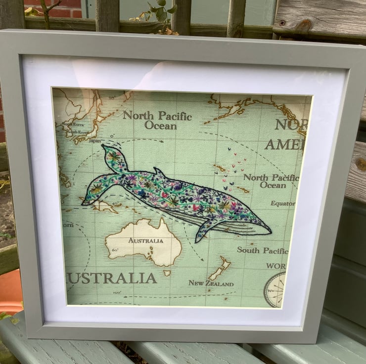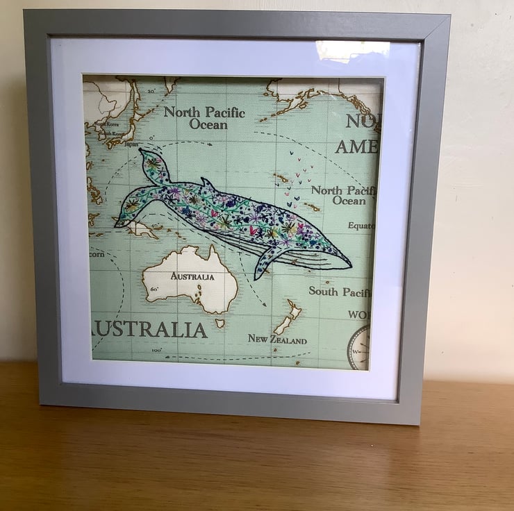 Hand Embroidered Framed Picture of Blue Whale. The inside of the Whales body is embroidered with flowers, with hearts imerging from his blow hole. The Whale is embroidered onto cotton fabric showing a grid map of the Pacific Ocean. The embroidery has been stretched and mounted onto board before framing. It measures 27cm square. This is the largest in a series of 3 Whales in matching frames.