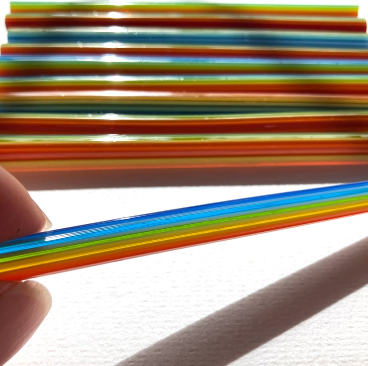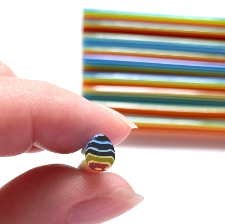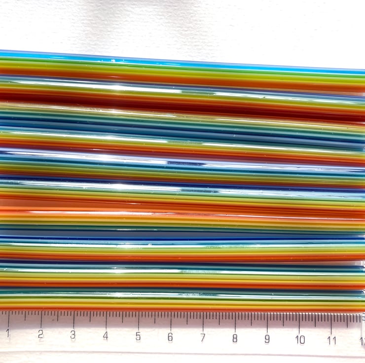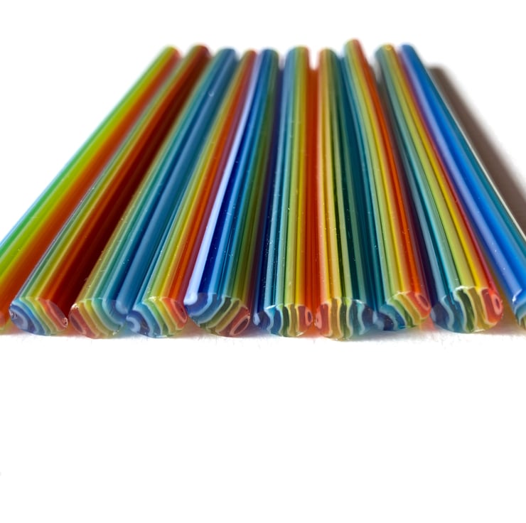 Ten approx 12cm lengths of cane to cut into rainbow egg murrini. Cane diameters measure approx 5-7mm.