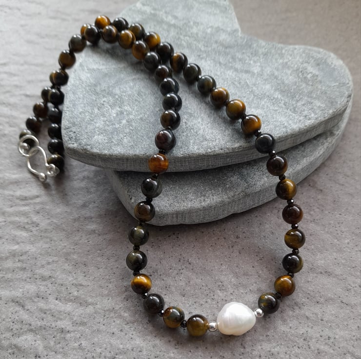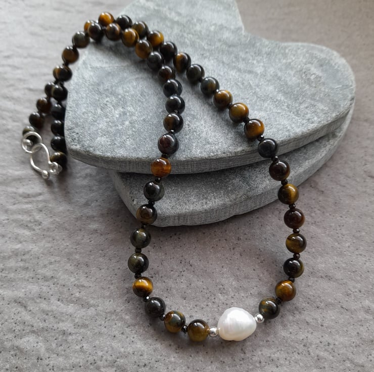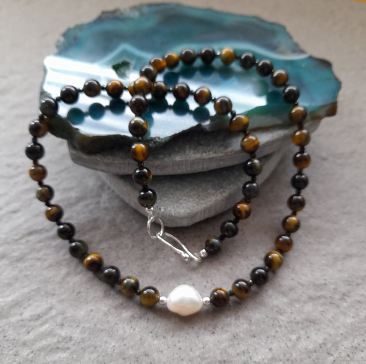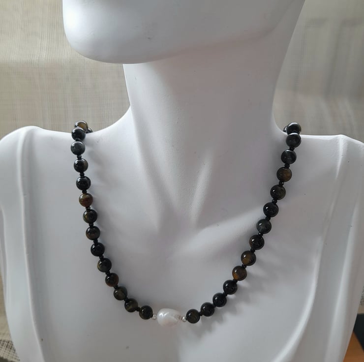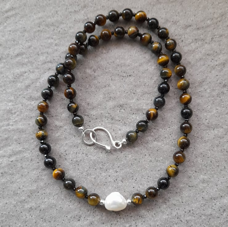 This necklace has been made with tigers eye, tiny faceted black spinel and a cultured fresh water pearl in the centre. Beads have been beaded onto beading wire and attached to a handmade argentium silver hook clasp 2 beads at the back of the neck are sterling silver