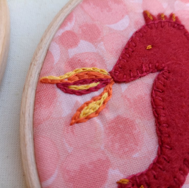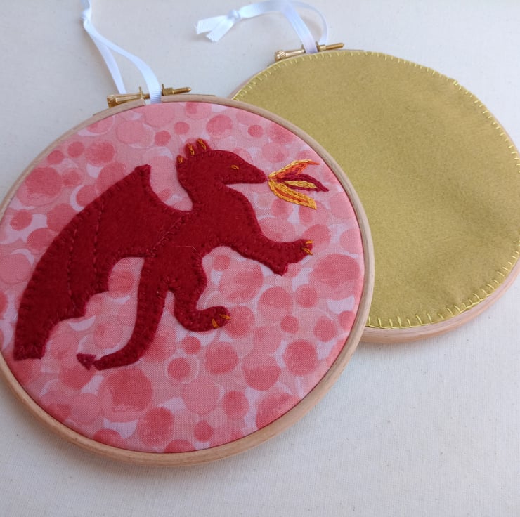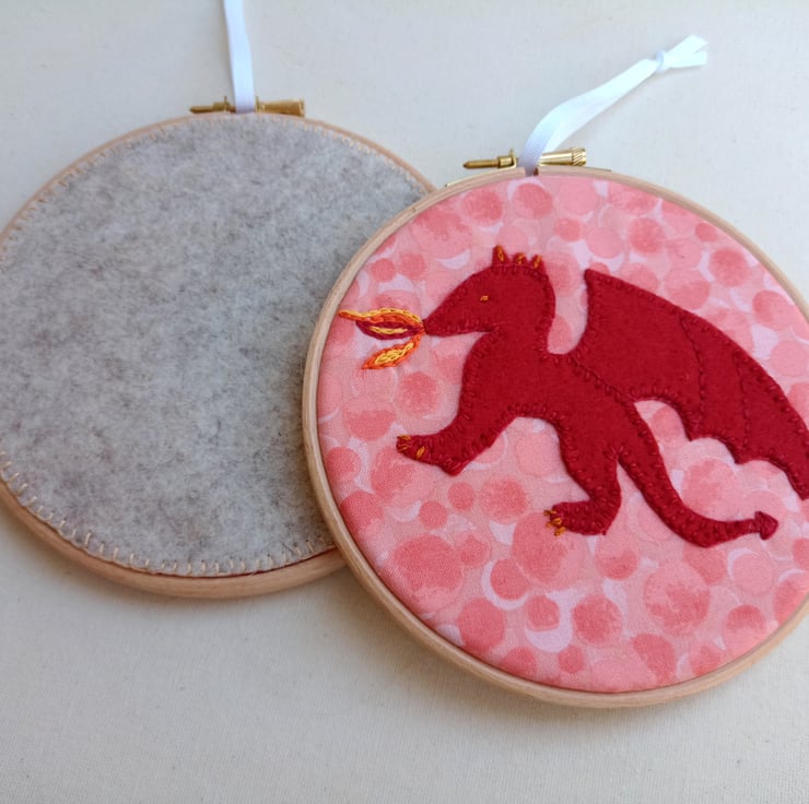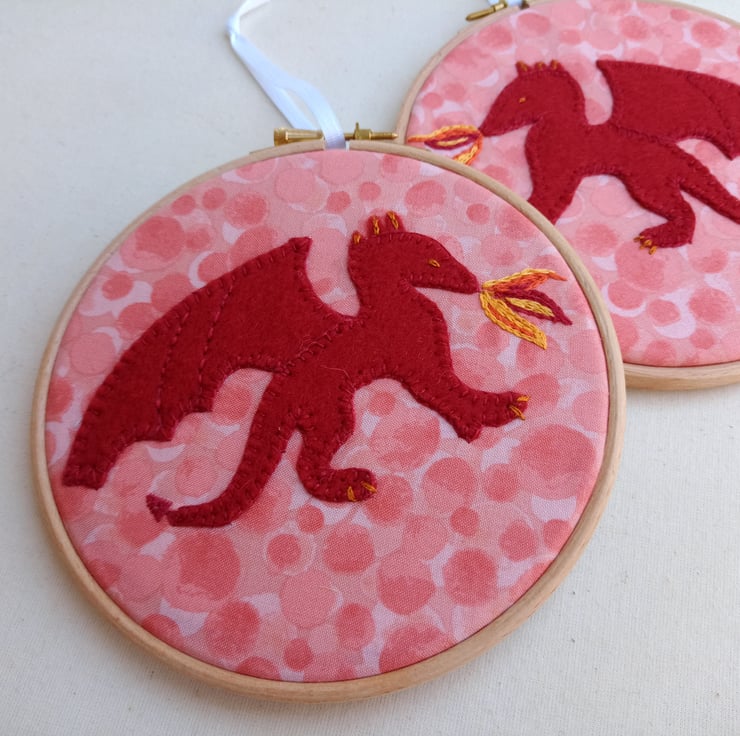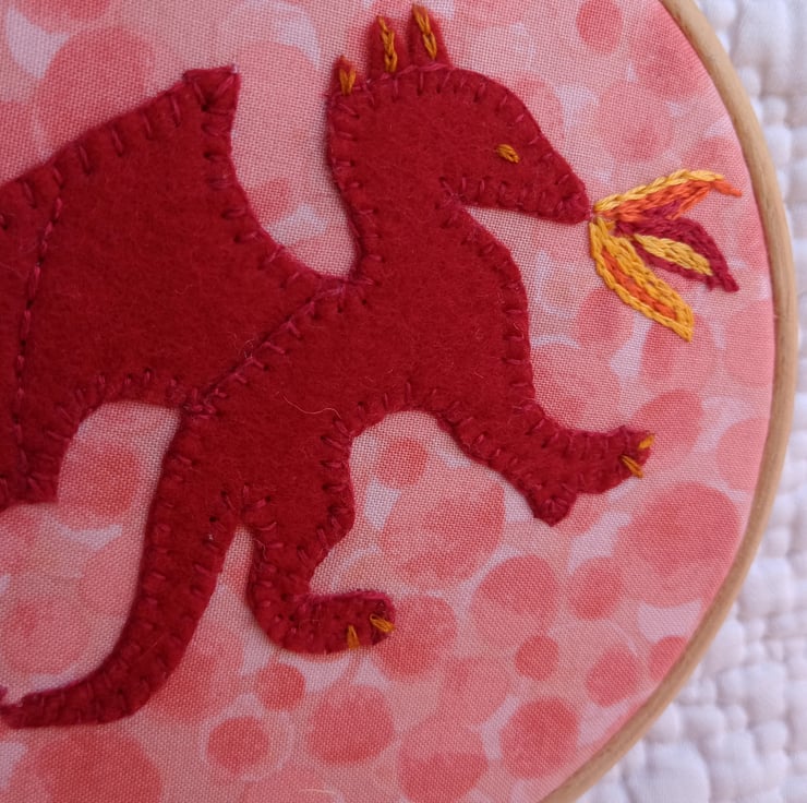 Based on my own hand drawn design, I hand cut the little dragon from pure wool felt in red, and hand stitch him to the orange-pink background fabric with blanket stitches all the way round the outline. Back stitches define his wing webbing, and chain stitches highlight his claws and horns. Finally, his flames are created by rows of chain stitch in glowing red, orange and yellow.