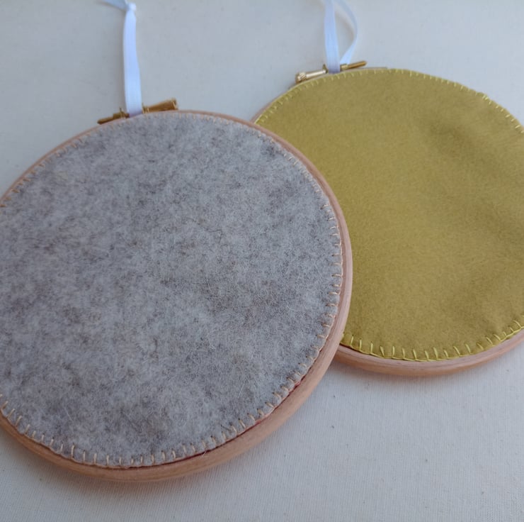The finished textile art is then mounted in a wooden hoop, and completed at the back with a circle of wool felt carefully hand stiched all the way round in blanket stitch - so it is as neat as the front.