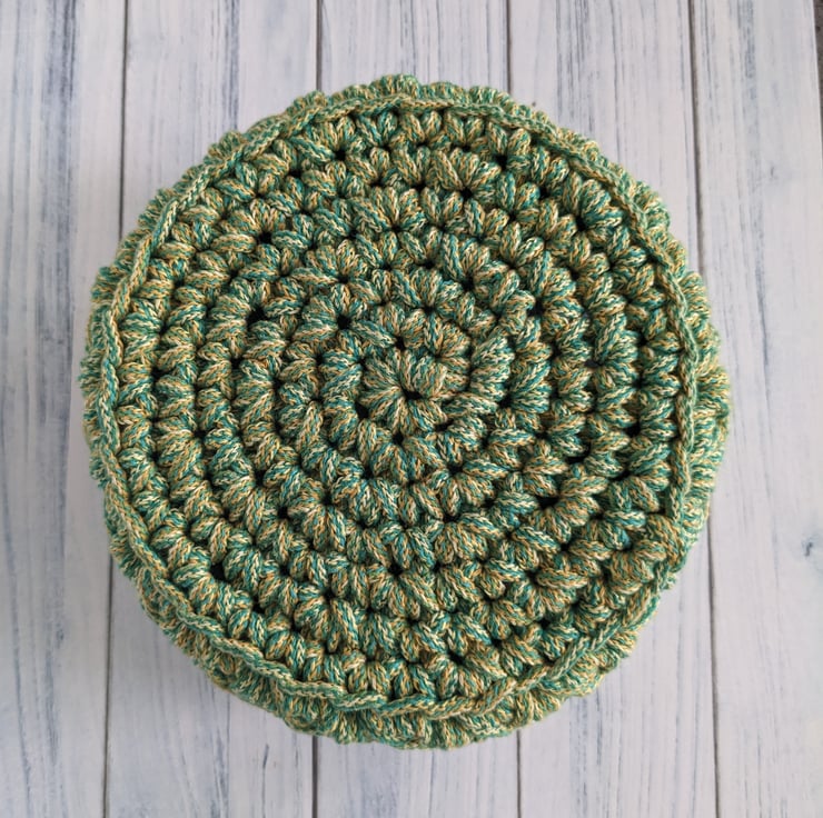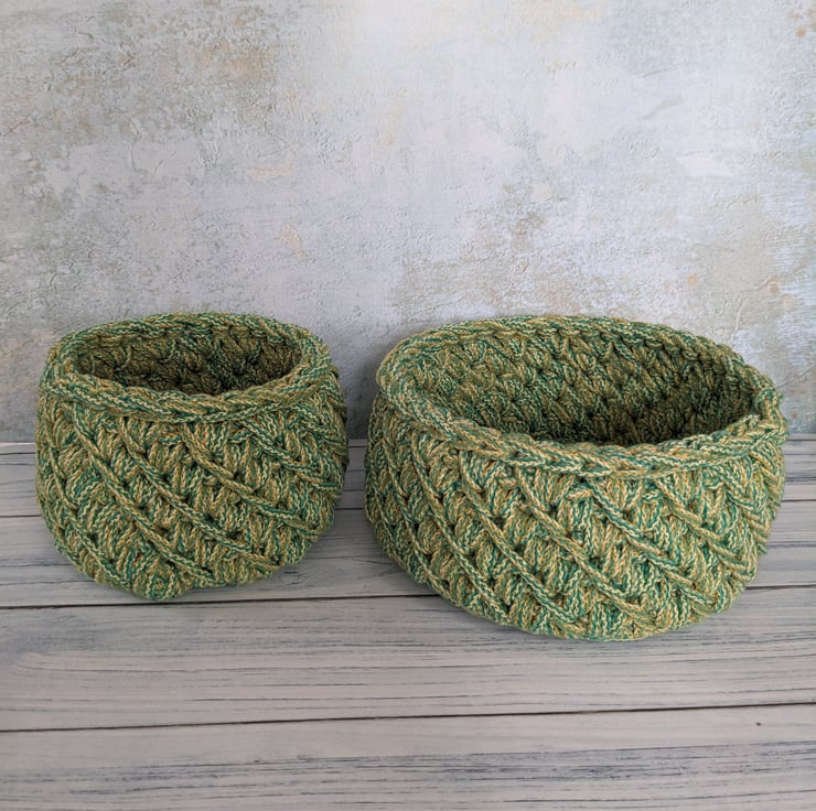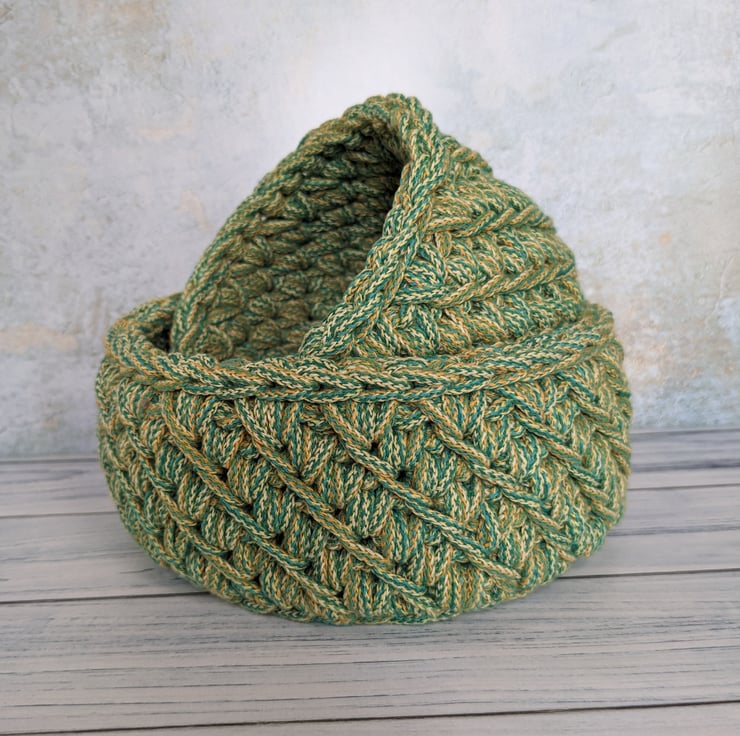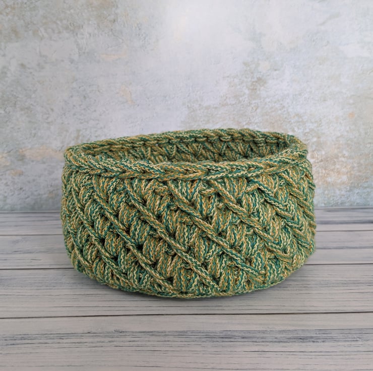 A useful round crocheted bowl, made from recycled cotton braided cord. Matches my small bowl (see separate listing). The colour, an unusual green and yellow mix, is called Spring! The bowl is sturdy yet flexible and keeps its shape well. The decorative slanted stitch gives the bowl a lovely woven type texture on the gently rounded sides. The top edge is finished off with slip stitch that gives strength and also provides a contrasting texture.