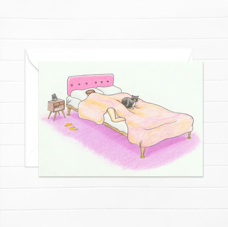 An original hand drawn pencil illustration for the cat lover in your life, printed as an any occasion card.