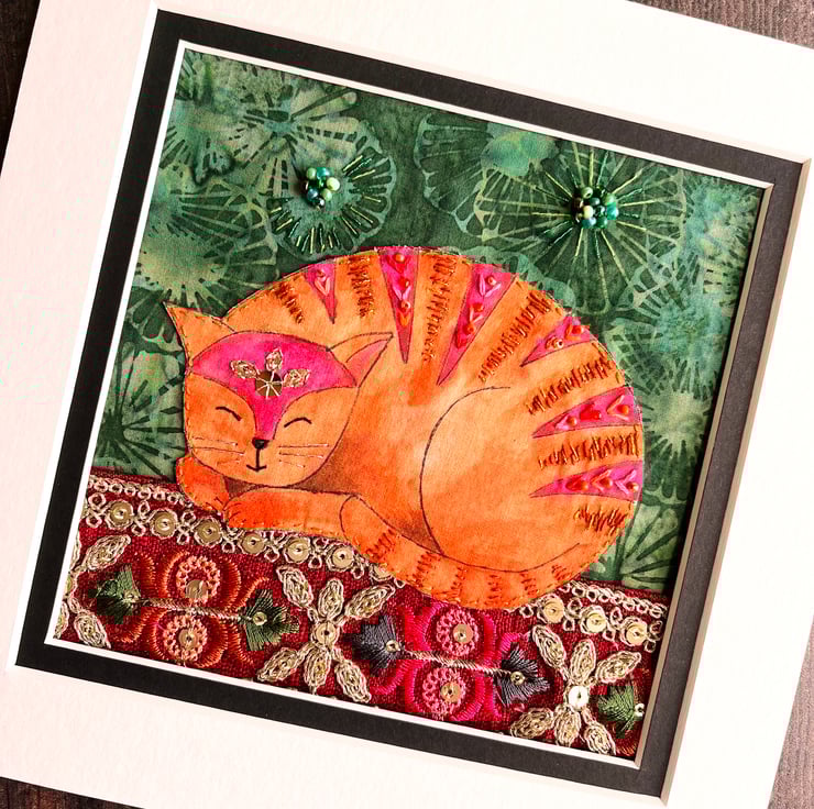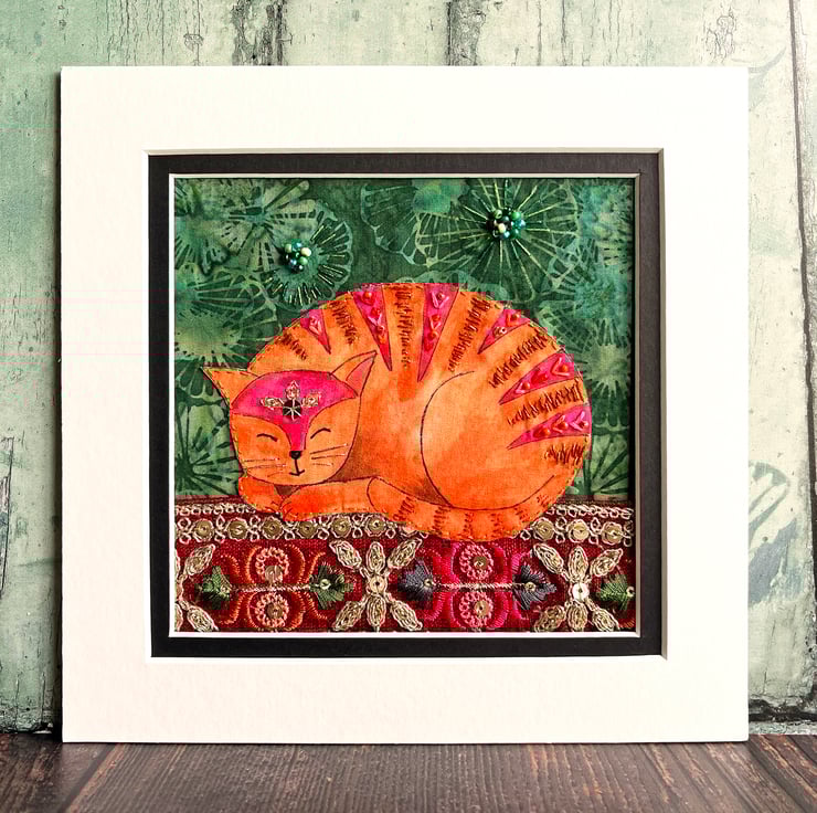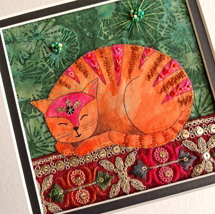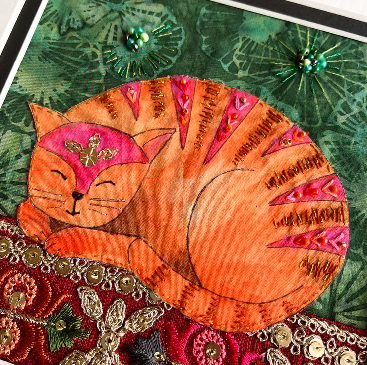 I've used a section of batik fabric for the background which I've embellished with seed beads and embroidery threads. The King of Bling is snoozing contentedly on a strip of embroidered Indian trim which is decorated with sequins and metallic threads.