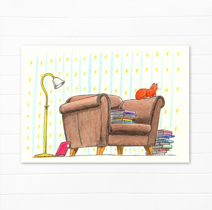 An original art card featuring an illustration ideal for a cat loving bookworm!