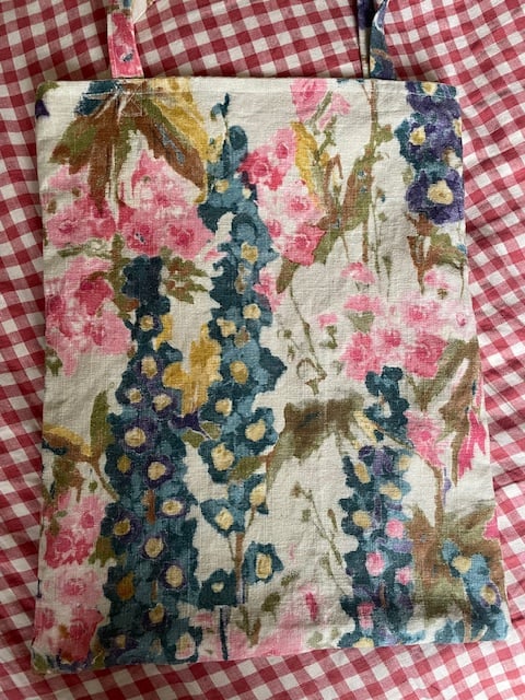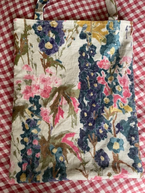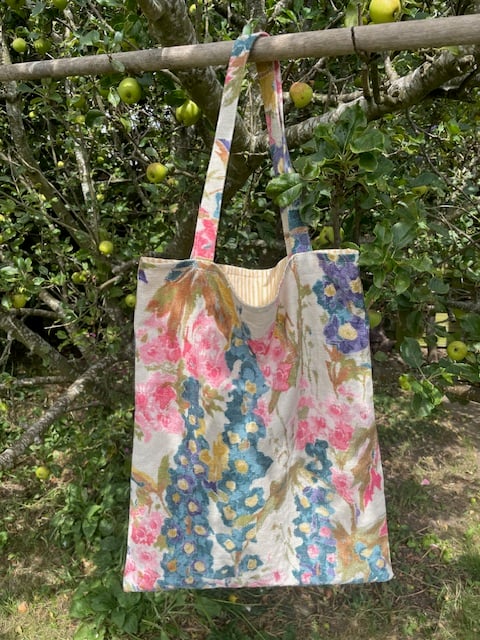 With its indigo and pink hollyhock design, this gorgeous floral shopping bag is perfect for Summer. Made from a cotton/linen blend, it is lined with yellow ticking stripe cotton fabric. The fabric is new and has been washed.