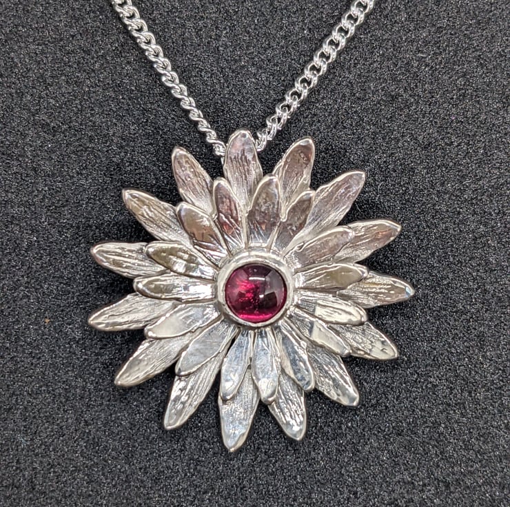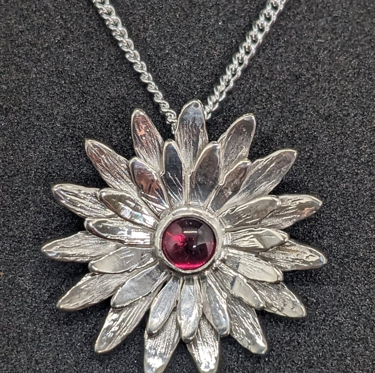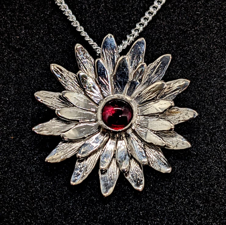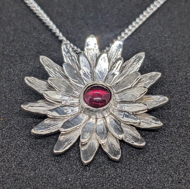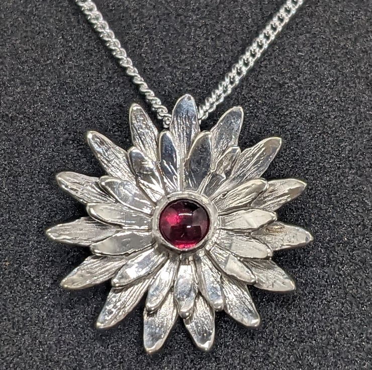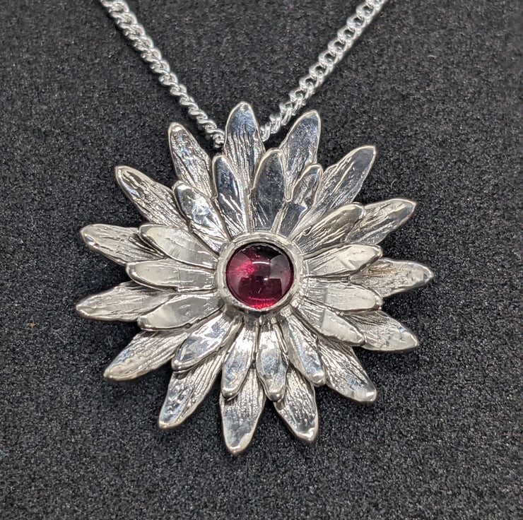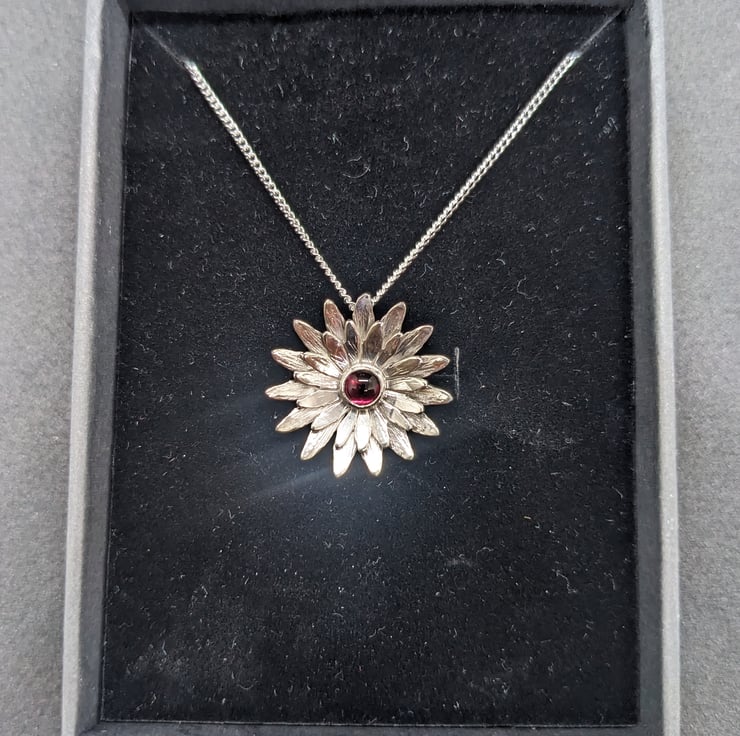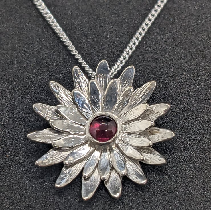 This beautiful double daisy pendant has been handcrafted from sterling silver. Both layers have been hand saw pierced and hammer textured. A deep red garnet cabachon has been bezel set in the centre of the flower. The pendant hangs from an 18 inch sterling silver curb chain and has been hallmarked.