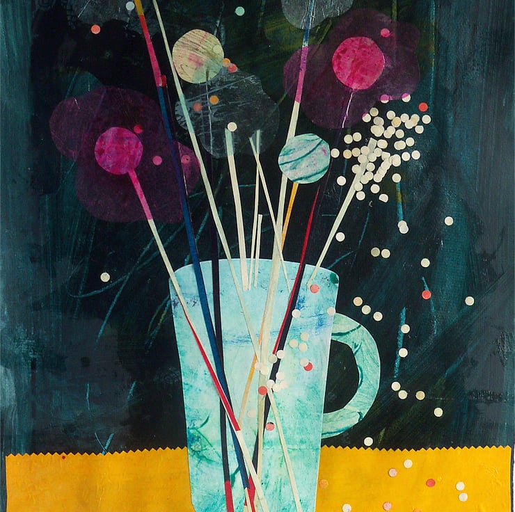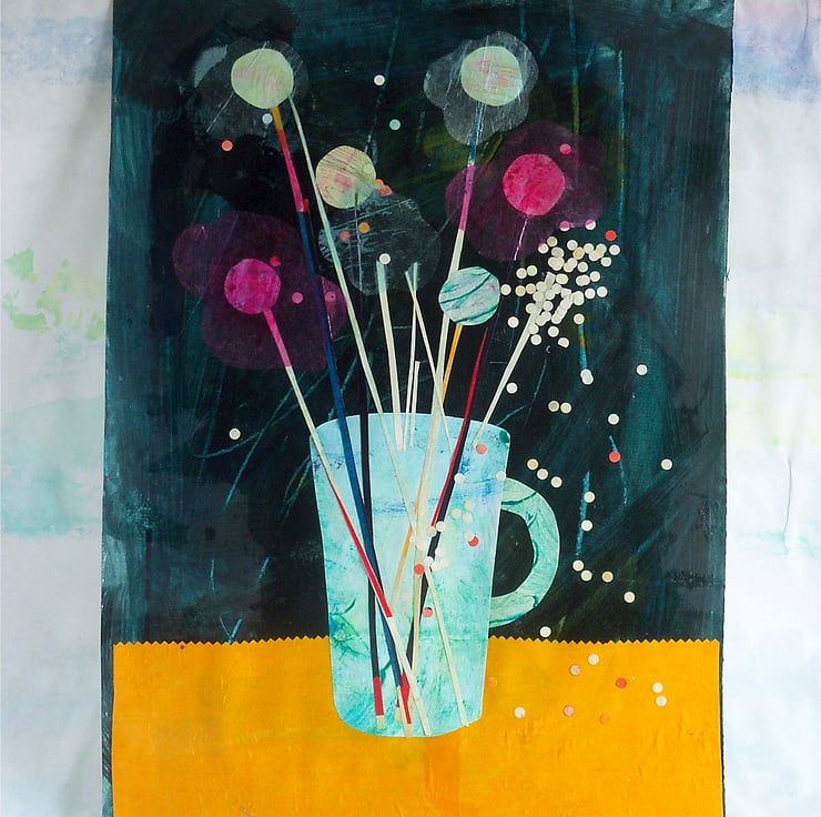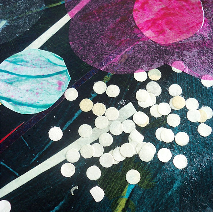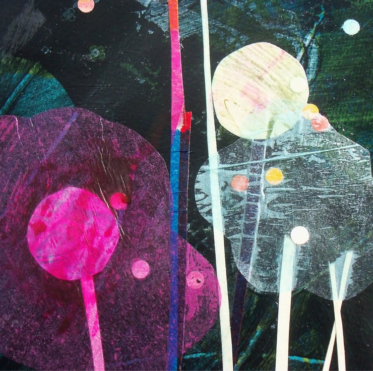 Collage made using cut out paper from my screen prints and paste paper. Assembled with care for this unique original piece.