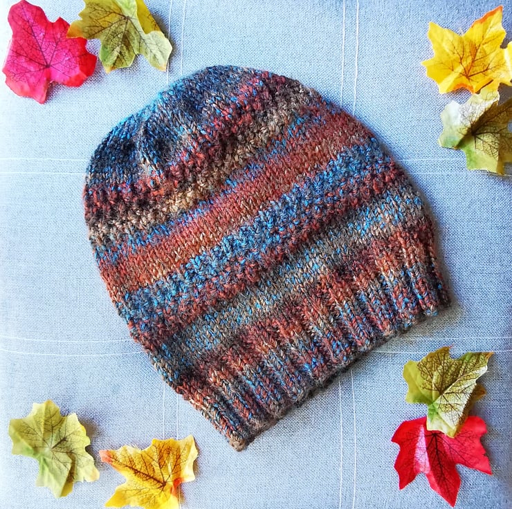 Flaunt your love of fall with this eye-catching, hand knitted striped beanie hat in autumn colours. Russet and gold merge with sienna and brown, interspersed with flecks of teal and chocolate to create stripes of autumnal gorgeousness that will really turn heads.