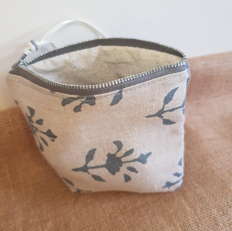 The front is a naturral linen with stylised floral design, and the back is cotton linen in a dusky blue. The pouch is lined with a teal cotton with a cream ribbon and two recycled African glass beads added to the zip