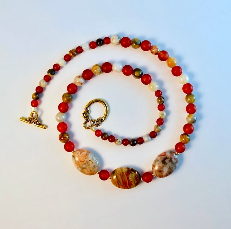 Beautiful and unusual multi-coloured necklace featuring as a centrepiece three 15x18mm Crazy Lace Agate ovals with beautiful colours and markings - creams, yellows, browns, greys, reds and pinks in swirling patterns.