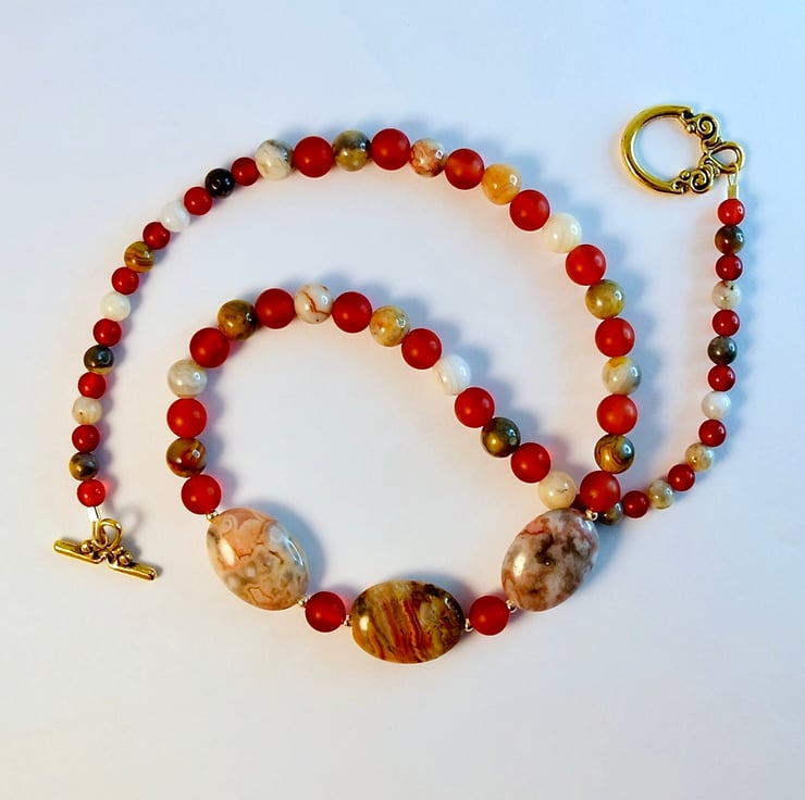 The necklace graduates from 6mm to 4mm alternating Crazy Lace Agate and frosted Carnelian round beads.