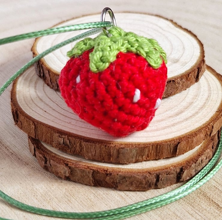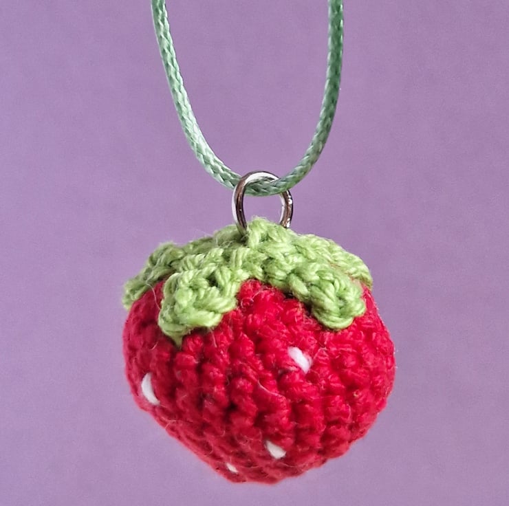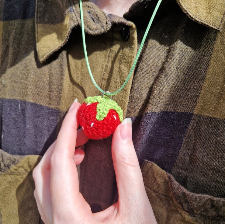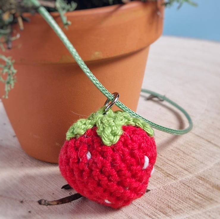 This strawberry pendant necklace makes an adorable statement summer jewellery piece or cottagecore accessory! The crochet strawberry is handmade from cotton and filled with recycled polyester. The necklace is made from green polyester.