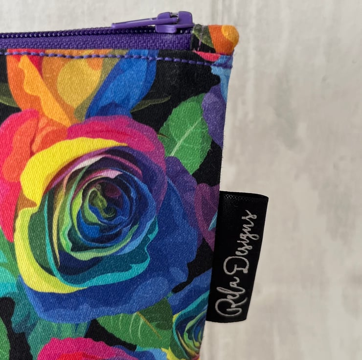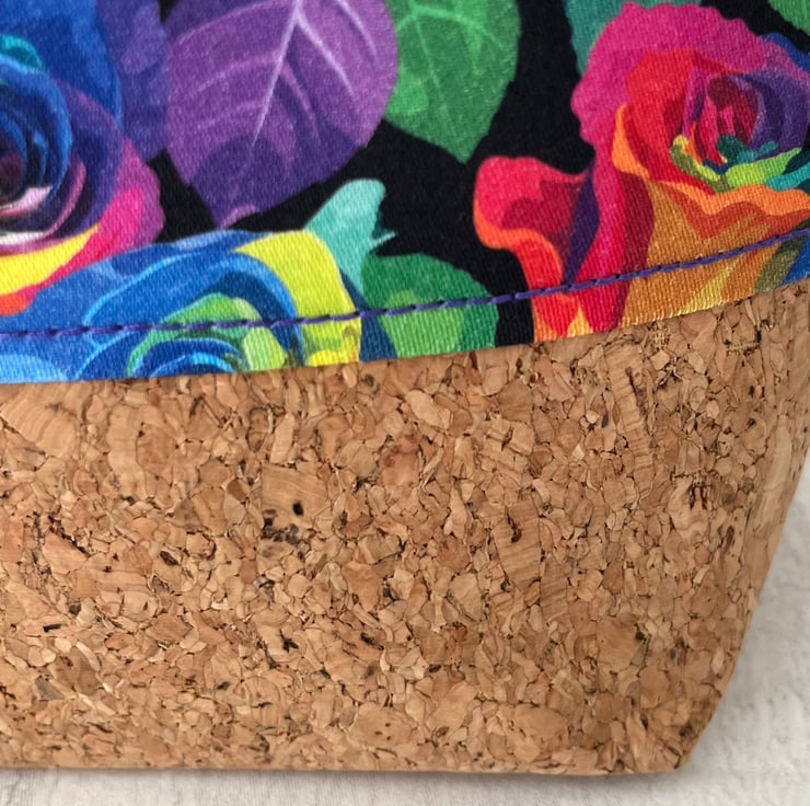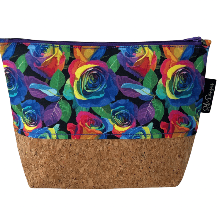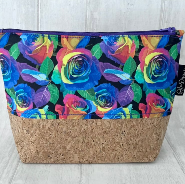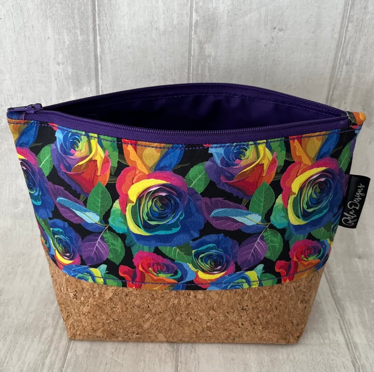 Makeup bag in colourful 100% cotton roses print with a cork base, lined with a purple waterproof nylon great for those inevitable spills. The cork base is also waterproof. so perfect for wet or steamy bathrooms.