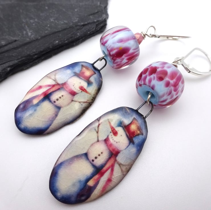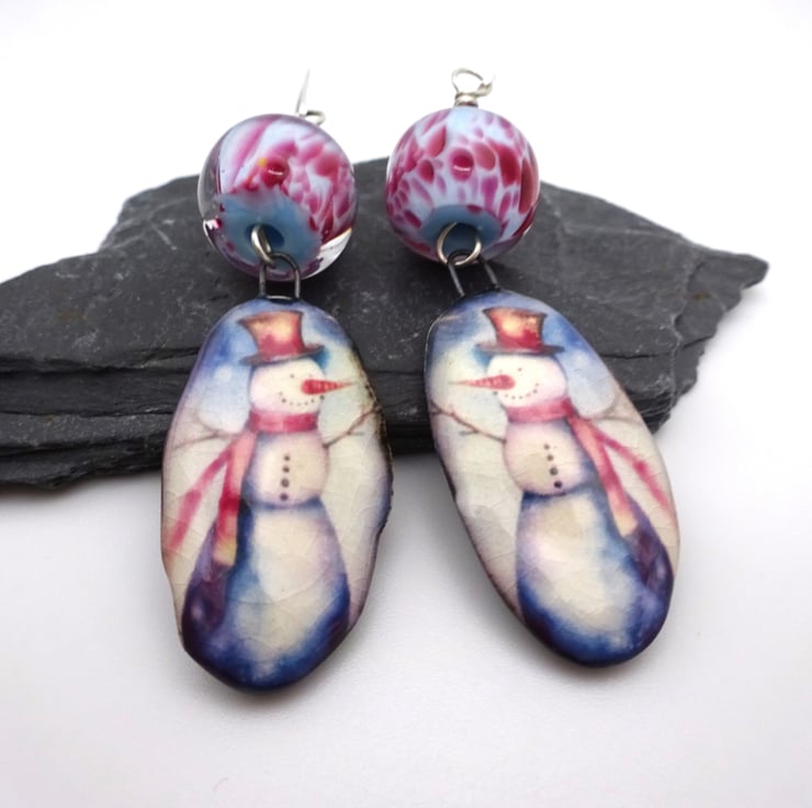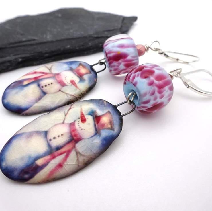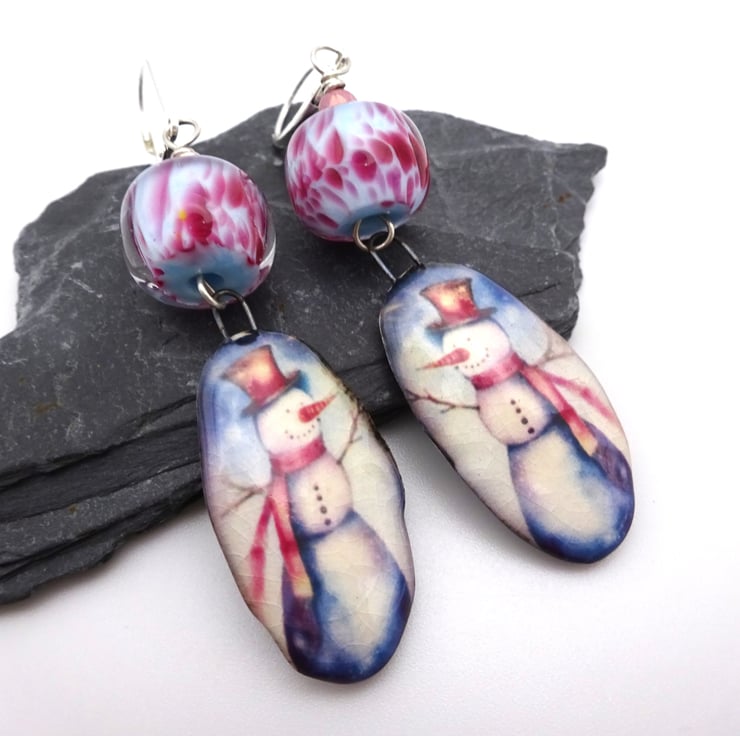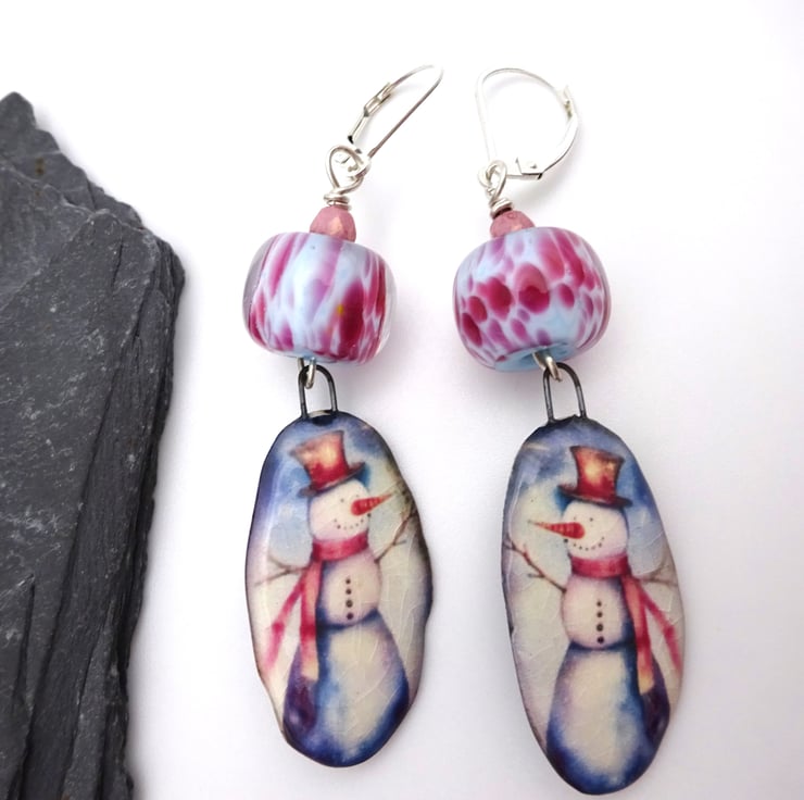 A pair of earrings made with sterling silver lever back ear wires, handmade lampwork blue and pink glass beads and handmade ceramic snowman charms.