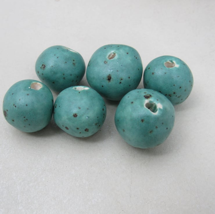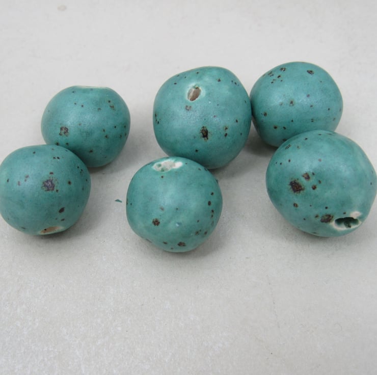 A mixture of handrolled ceramic beads, finished with a soft eggshell blue glaze.