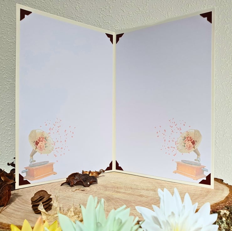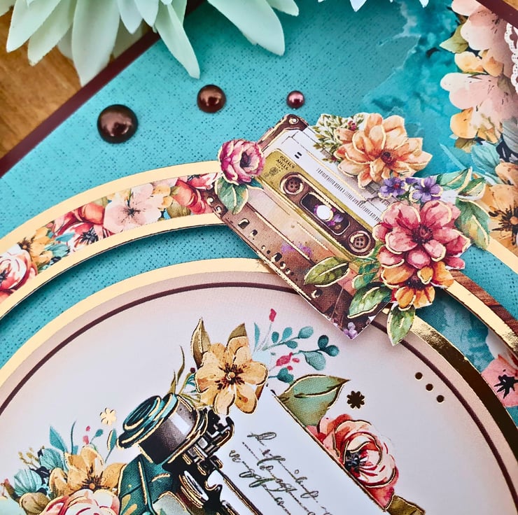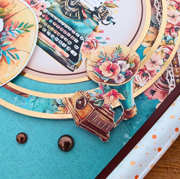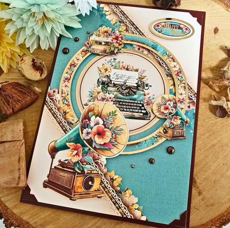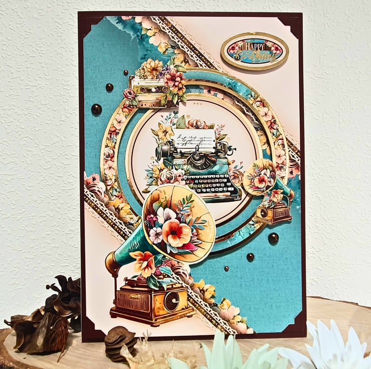 A handmade birthday card in nostalgic, vintage style. It displays an old typewriter, gramophone & cassette tape & uses the very classic colour of beige, brown & teal, a perfect reminder of the olden days to those who miss them & enjoy an escape from the present time!