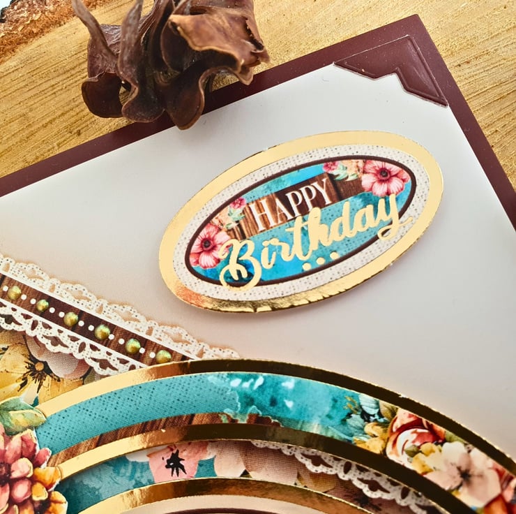 The card consists of mats of brown card layered with quality cardstock, printed with vintage style florals and lace patterns. It is decorated with gold foiled toppers & ephemera, along with the sentiment "Happy Birthday", and it is embellished with metallic brown pearls, to create a nostalgic look. Inside, two blank panels of coordinating inserts will provide you with enough space for your handwritten message & wishes.